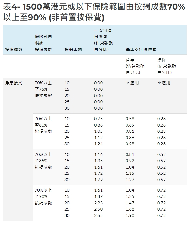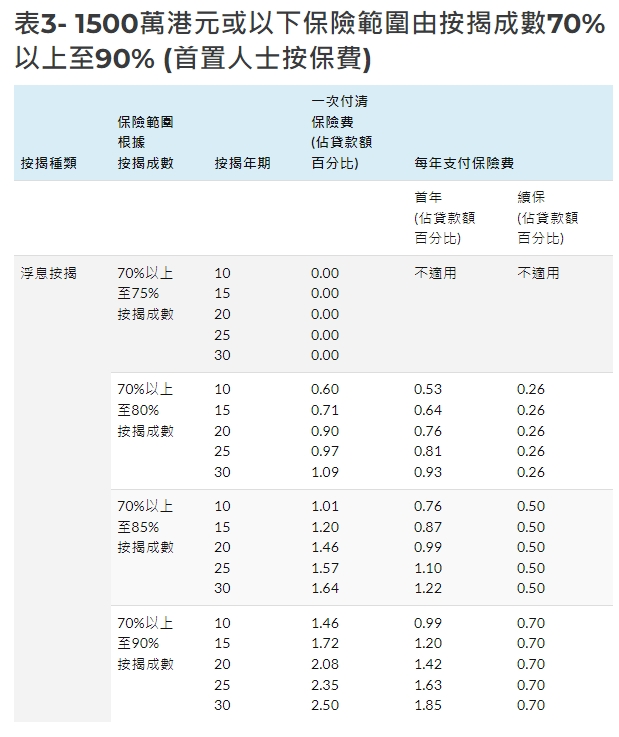 按揭保險不單提供高成數按揭給業主,更保障銀行。保費以貸款額計算,可選擇一次性支付,亦可計入貸款額內作分期支付,而且首置人士比非首置可享更低按揭保險費。有關按揭保險計劃的保費,可參考下列各表。