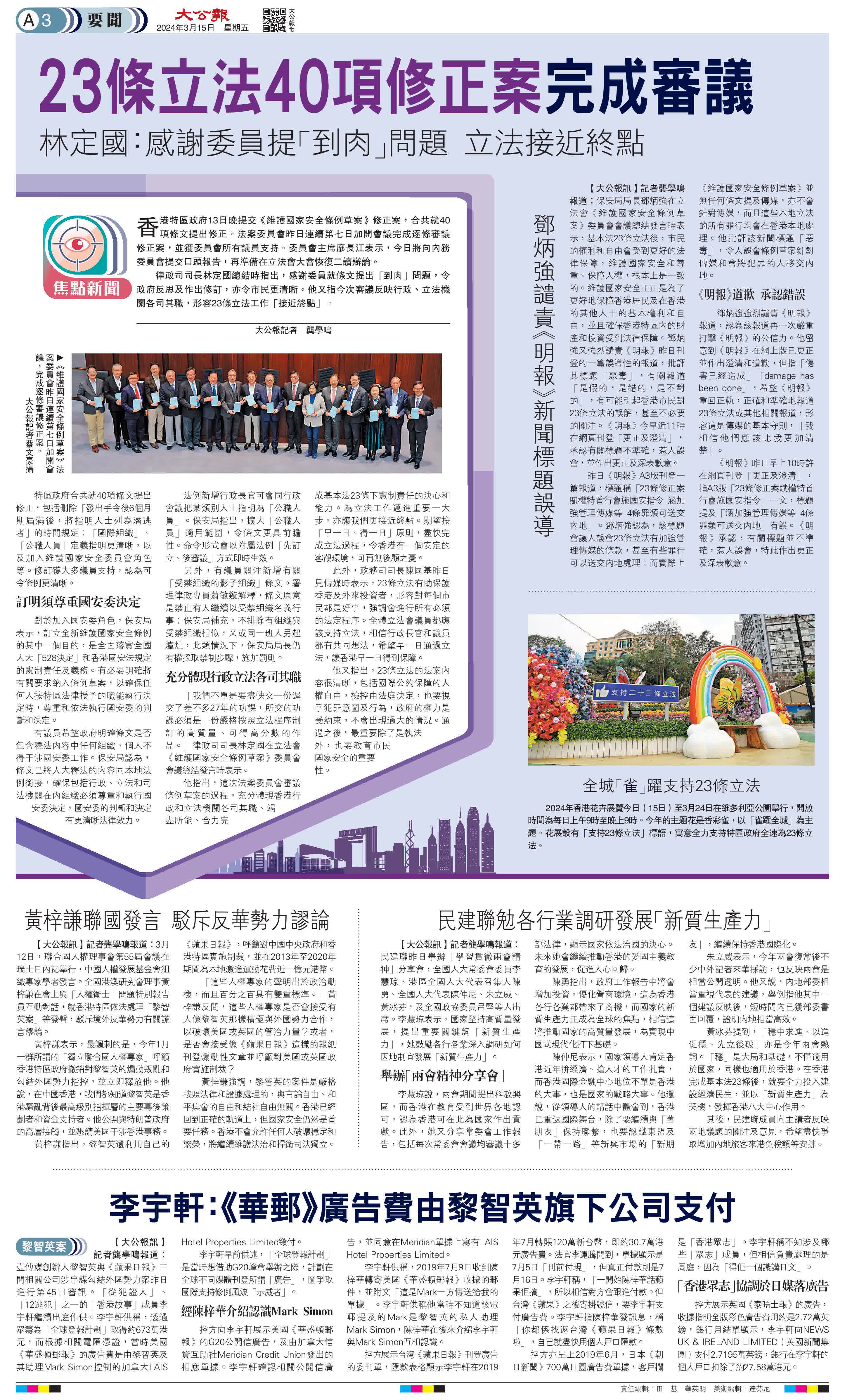 他又指出,23條立法的法案內容很清晰,包括國際公約保障的人權自由,檢控由法庭決定,也要視乎犯罪意圖及行為,政府的權力是受約束,不會出現過大的情況。通過之後,最重要除了是執法外,也要教育市民國家安全的重要性。