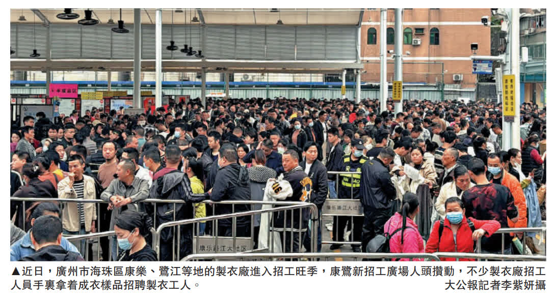 (大公報記者 李紫妍 廣州報道)「我在這裏站了三天了,還沒找到合適的工人。」清晨七點,一位滿臉疲態又心急如焚的製衣作坊老闆對記者說。隨着開年後訂單陸續到來,廣州海珠康鷺片區的製衣廠再度迎來招工旺季。記者現場直擊發現,一大早康鷺新招工廣場便裏三層外三層地,熱鬧非凡。成百上千位製衣廠老闆手裏拿着最新訂單的樣品成衣,列隊招攬製衣工人;不少務工人員則穿梭其中問詢,期盼找到心儀崗位,現場氣氛熱烈。有專家指出,招工市場的熱度折射出經濟回暖的溫度。