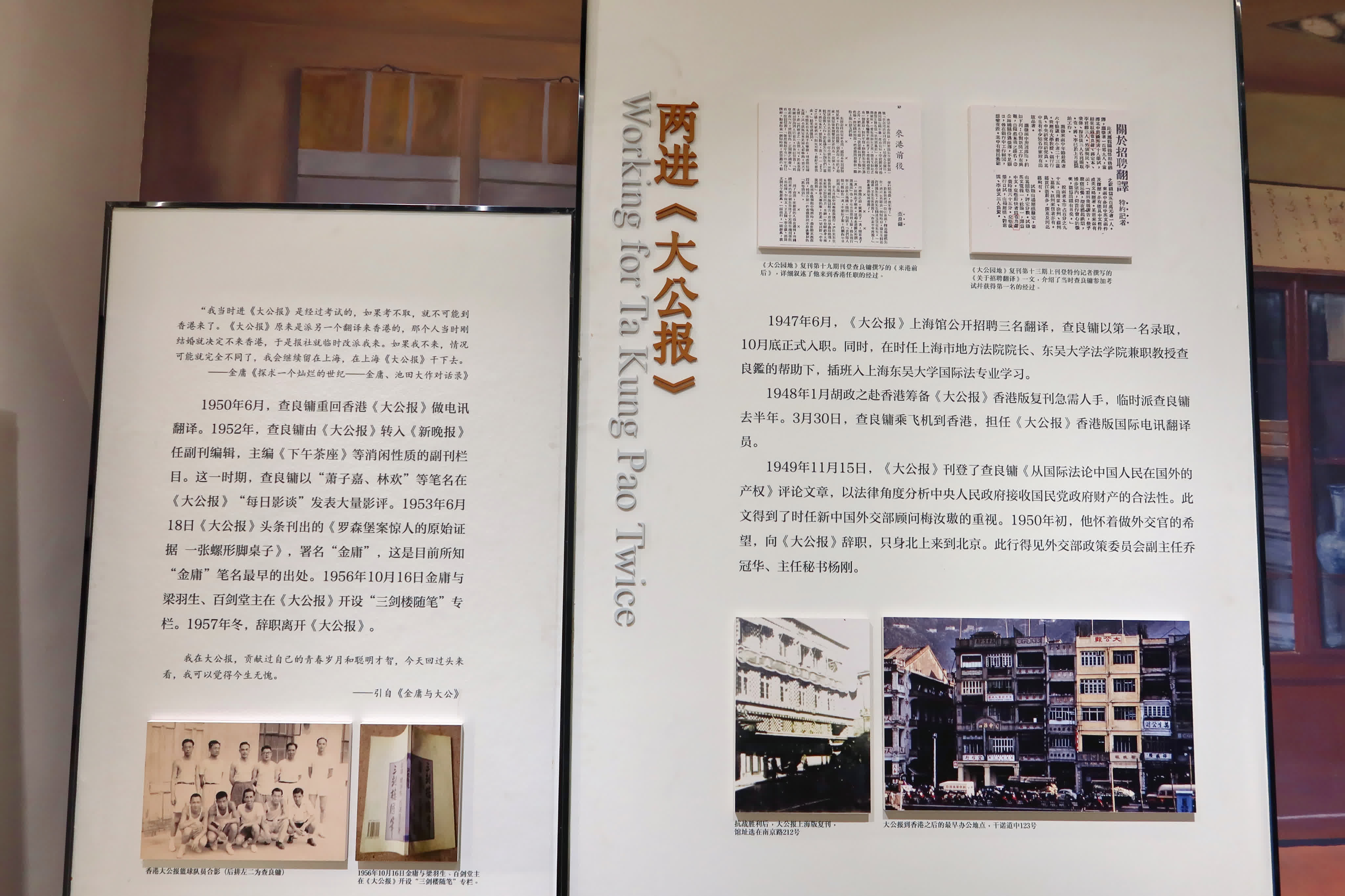 金庸在港期間,1950年,《大公報》所屬《新晚報》創刊,金庸調任副刊編輯。1955年,金庸開始在《新晚報》上連載《書劍恩仇錄》,開啟了武俠小說生涯。1959年,金庸與友人沈寶新創辦《明報》,後來又創辦了《明報月刊》(1966年)、《明報周刊》(1968年)和《明報晚報》(1969年),更在新加坡創辦《東南亞周刊》(1964年)和《新明日報》(1967年)……