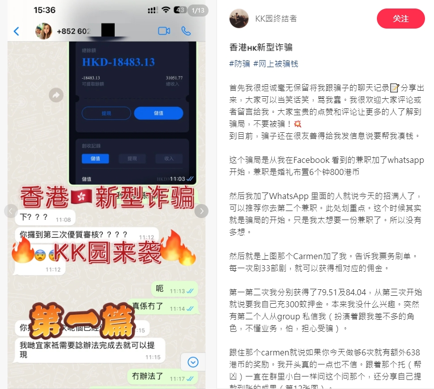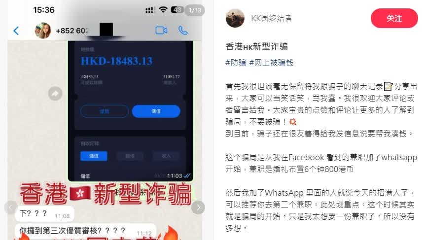 該網民在Facebook看到的高薪兼職招聘後加了騙徒的whatsapp,騙徒聲稱今天的兼職工作招滿人了,可以推薦她去第二個兼職。該網民表示自己太需要一份兼職了,便答應了。隨後騙徒便拉她進入一個做票務評分助理的群組,也就是所謂的「刷單」,每一次刷33部劇,獲得評分,便會得到相應佣金。第一輪結束,事主確實獲得了70港幣佣金,但此時系統顯示需要充值保證金以進入下一輪。本來事主興趣平平,突然有另一個人從群組內私信她,分享自己獲得的高額佣金,引誘事主繼續刷單。事主聲稱前四次即使充值保證金仍可退回並獲得佣金,第六次充值保證金後,突然出現「優質審核」顯示要充值更多的錢激活賬戶,去獲取更多佣金。期間騙徒還很好心地借錢給事主充值保證金。到最後系統顯示需要一次性充入金額高達18483.13港元,事主才意識到自己被騙了,此時已經被騙走近7000港元,隨後她截圖並前往警局報案。