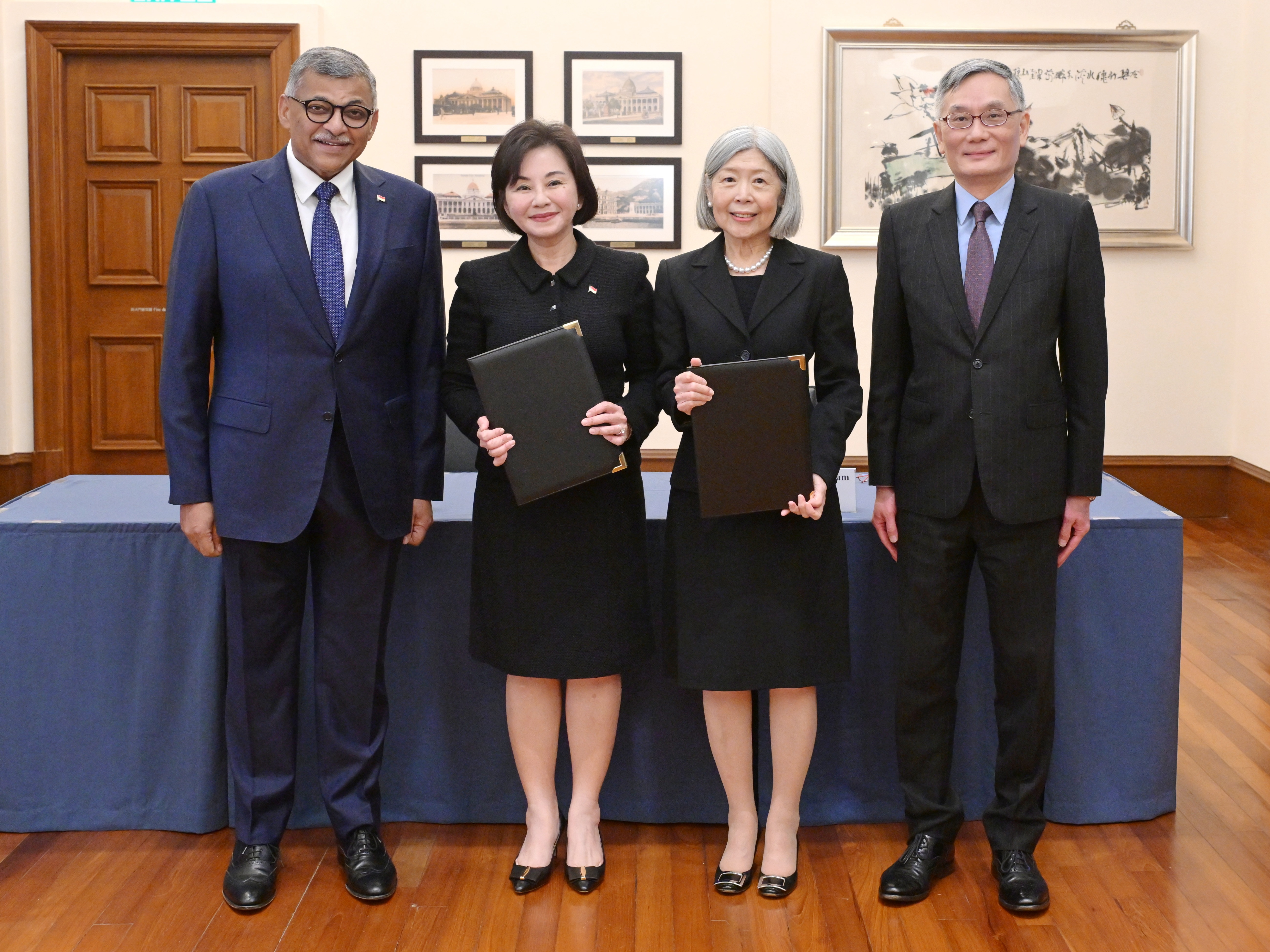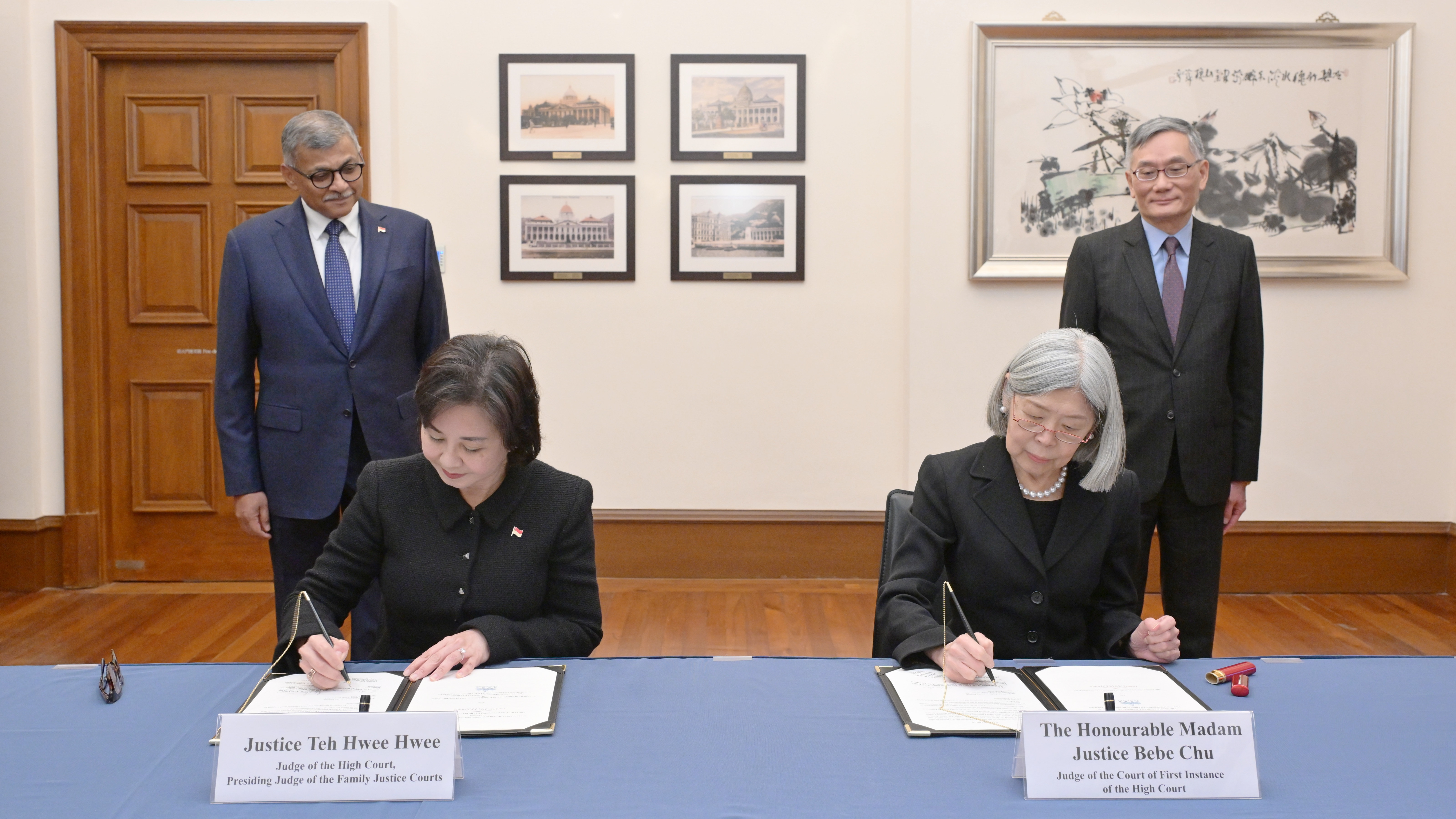 在香港特區終審法院首席法官張舉能與新加坡首席大法官梅達順的見證下,香港特區高等法院原訟法庭專責家庭案件法官朱珮瑩和新加坡高庭法官及家事司法法院首席法官鄭慧慧今日簽署諒解備忘錄。