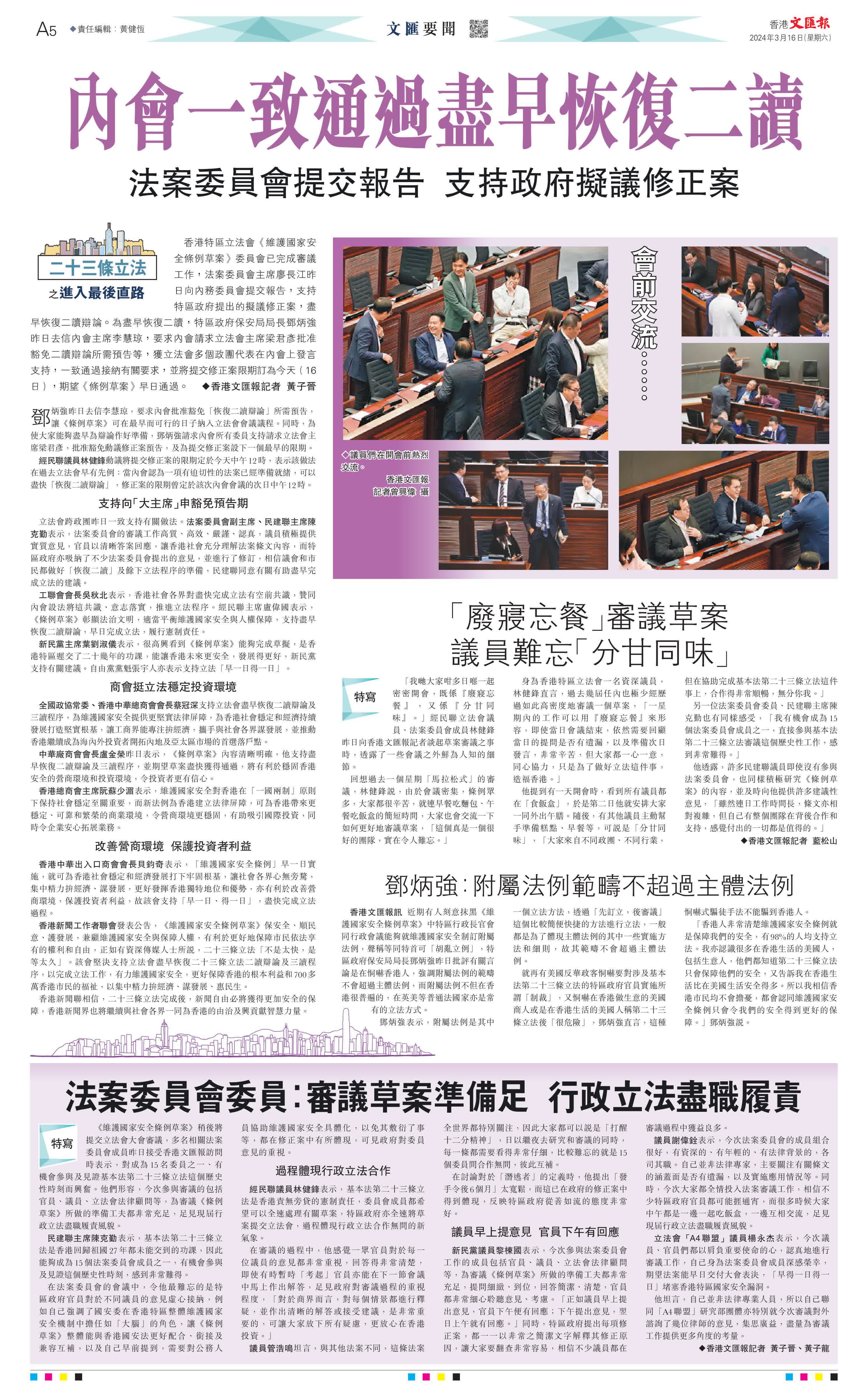 另一位法案委員會委員、民建聯主席陳克勤也有同樣感受,「我有機會成為15個法案委員會成員之一,直接參與基本法第二十三條立法審議這個歷史性工作,感到非常難得。」