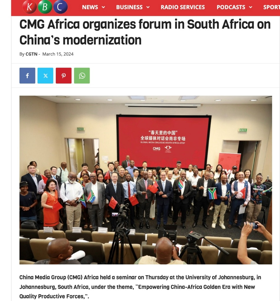 當地時間3月14日,由中央廣播電視總台主辦的「春天裏的中國」全球媒體對話會南非專場在約翰內斯堡大學舉行。對話會以「新質生產力賦能中非黃金時代」為主題,來自中國駐約翰內斯堡總領館,南非政府、主流媒體、知名智庫專家學者代表等與會嘉賓圍繞中國推進新質生產力給世界的機遇、非洲大陸如何借鑒中國式現代化成功經驗、人工智能為中非合作帶來新機遇等話題展開交流研討。