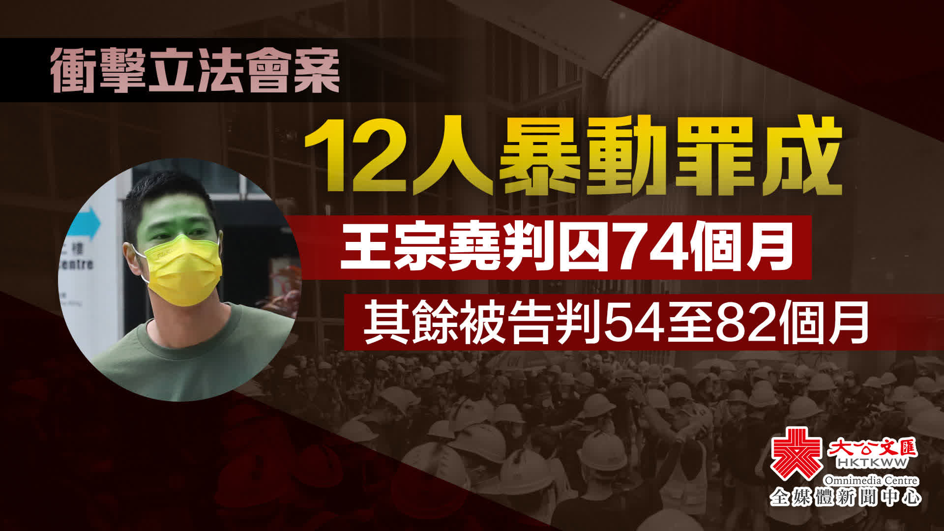 大公文匯全媒體報道,2019年7月1日,數百名暴徒圍攻及衝入立法會大樓大肆破壞,其中14人被控暴動等罪。案中8名被告,包括鄒家成、劉頴匡等早前承認暴動罪,王宗堯等4人經審訊後暴動罪成,另有2名涉案記者「進入或逗留在會議廳範圍」罪成。區院暫委法官李志豪今日(16日)於西九龍法院判處王宗堯監禁74個月,兩記者罰款1000至1500元,其餘被告入獄54個月20天至82個月。