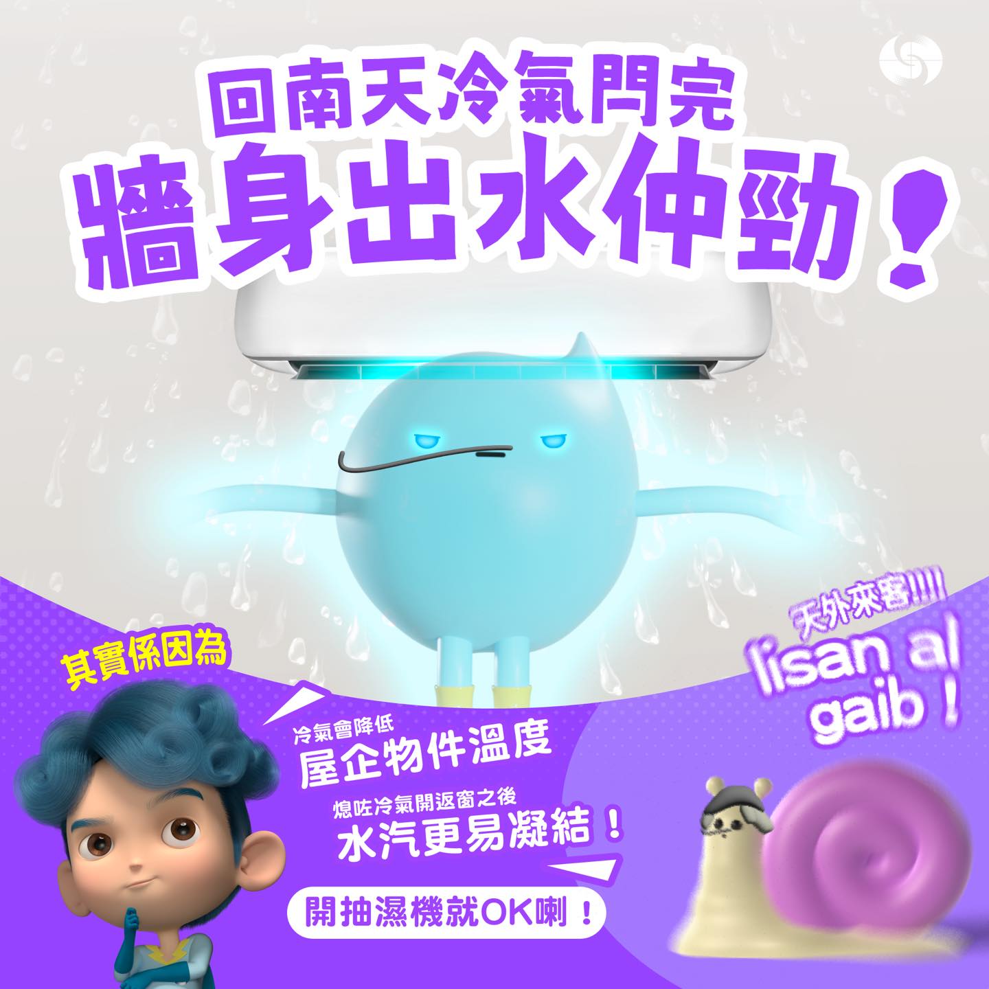 天文台提到,遇到這樣的天氣,用抽濕機是一個好辦法,在抽濕同時,不會降低室內溫度,牆身就沒有這麼容易再出水了。