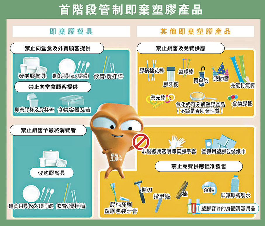 ▶預先包裝的食品/飲品:如紙包飲品上附帶的即棄膠飲管、杯麵內附的即棄膠匙,以及雪糕杯內附的即棄膠匙等