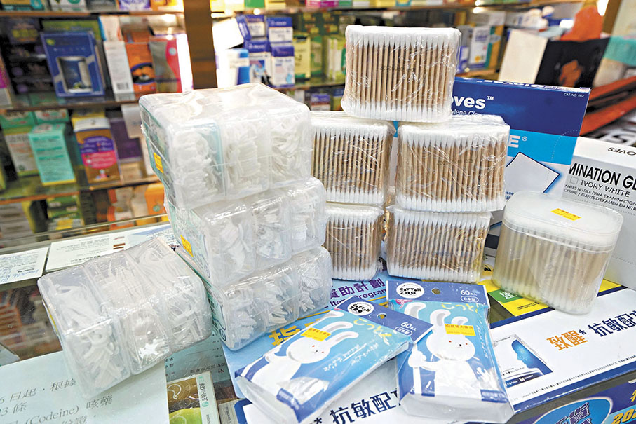 香港文匯報記者日前到港九藥房總商會理事長林偉民位於沙田的藥房直擊,發現貨架上再也不見膠柄棉花棒等產品,改為出售紙柄或木柄的棉花棒,也再無膠牙籤出售。附近連鎖個人用品專門店,原本擺放膠柄棉花棒的貨架也空空如也。店員表示,產品已被搶購一空,「正採購非膠製的棉花棒,預計快將有貨抵港。」