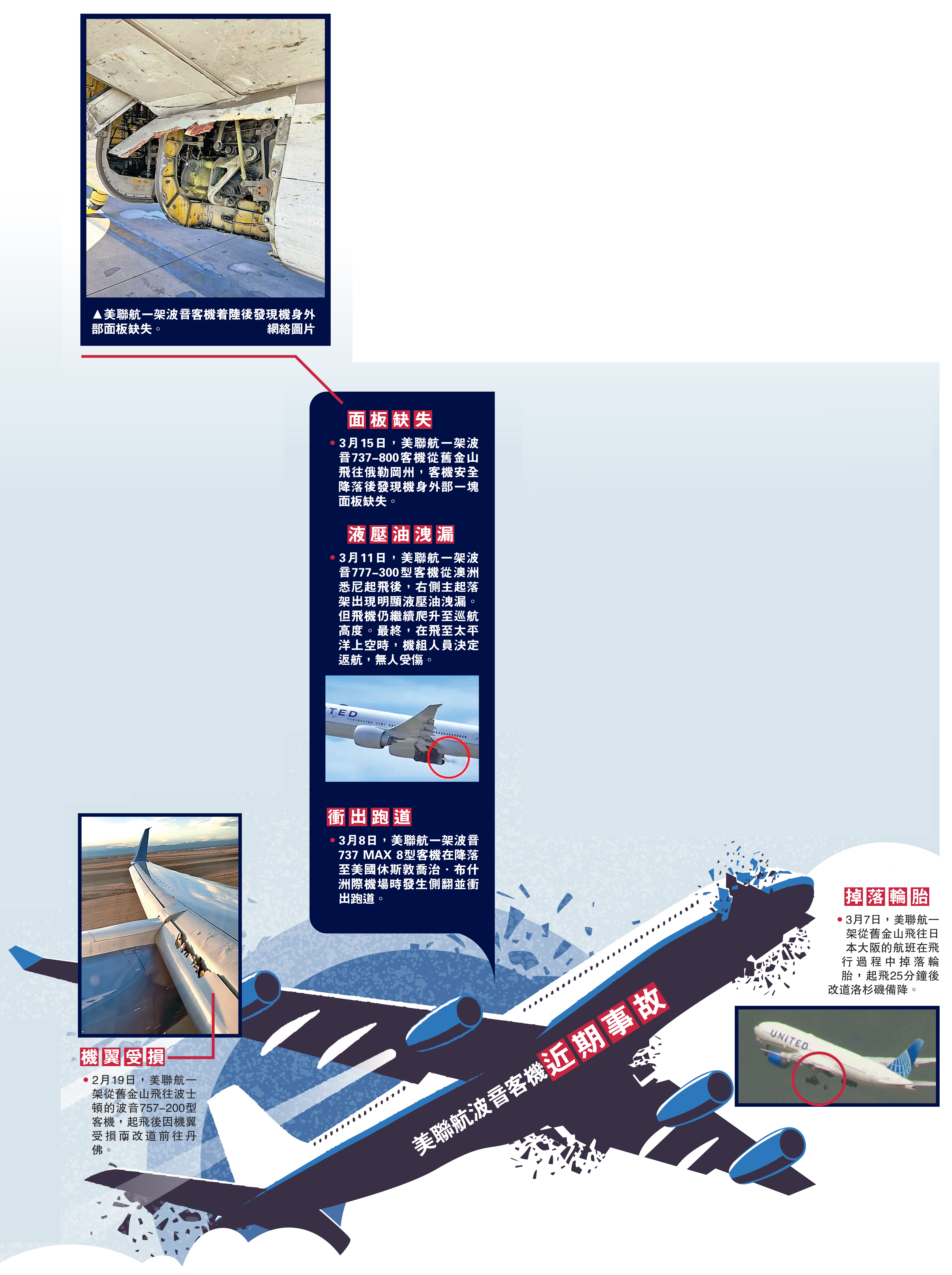 大公報綜合報道,美國聯合航空公司當地時間15日稱,旗下一架波音737-800客機當天在俄勒岡州安全降落後發現機身外部一塊面板缺失。美國聯邦航空管理局(FAA)表示,將對該起事故展開調查。這並不是美聯航的客機首次遺失部件,該公司本月初一架客機在飛行中發生輪胎掉落事故,美媒指,包括機翼受損、液壓油洩漏和衝出跑道等,這是美聯航近2周來,至少第9起事故。
