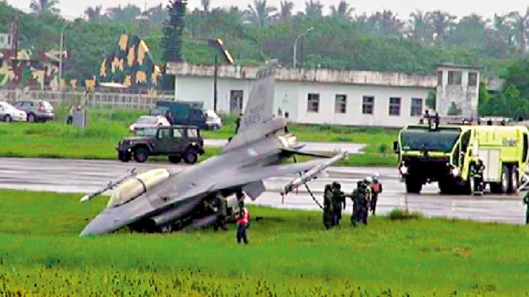 •一架F-16戰機在演習預演中降落時衝出跑道,機頭插入跑道口的土裏,預演也因此暫停。