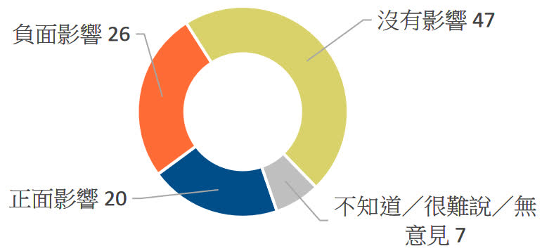 調查發現,合共六成七受訪者表示《維護國家安全條例草案》對市民日常生活行使基本權利有「正面影響」(20%)及「沒有影響」(47%),表示有「負面影響」的佔兩成六,「不知道/很難說/無意見」則佔百分之七。