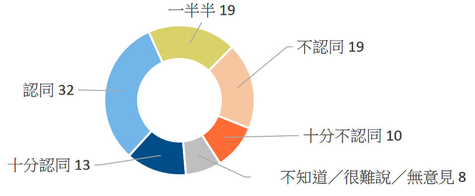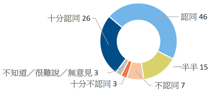 合共七成二受訪者表示「十分認同」及「認同」香港有維護國家安全的憲制責任,表示「一半半」的佔一成半,「十分不認同」及「不認同」的則共佔一成,而表示「不知道/很難說/無意見」的佔百分之三。