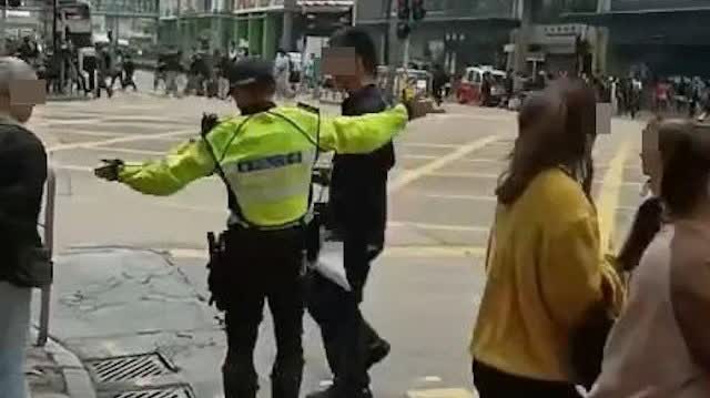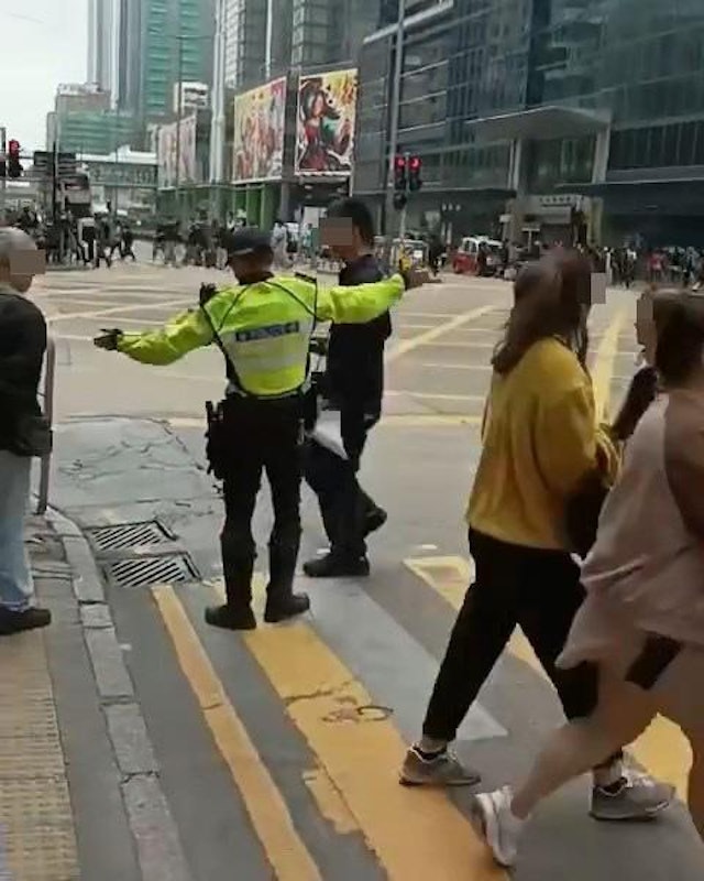 本港社交平台今日下午流傳一段影片,片中見到長沙灣道欽州街交界十字路口,有男行人在全部交通燈亮起的綠燈下,打斜走過馬路,結果當場被警員叫到一旁罰款,相當無奈。