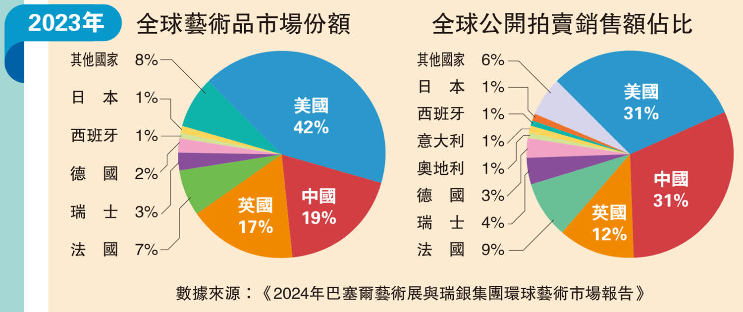 3月13日,巴塞爾藝術展和瑞銀集團(「瑞銀」)發布《2024年巴塞爾藝術展與瑞銀集團環球藝術市場報告》。報告指出,包括香港在內的中國市場已經超越英國,成為繼美國之後的全球第二大藝術市場,去年中國藝術市場銷售額增長9%,達到約122億美元,佔全球藝術市場份額的19%。