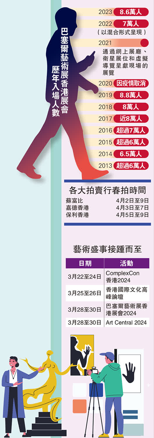推動藝術市場的繁榮,藝術展會的作用不可小覷。今年的巴塞爾藝術展香港展會全面恢復到疫情前水平,於3月28日至30日呈獻來自40個國家及地區的242間頂尖藝廊,參展藝廊數目相比去年增加了65間。另一項香港藝術界年度盛事,Art Central展覽將在3月28日至31日雲集亞洲先鋒畫廊的新進菁英以及國際知名藝術大師的精心傑作,聚集95間來自香港、亞洲及世界各地的頂尖畫廊,展出一系列塑造當代藝術的藝術家之作品。