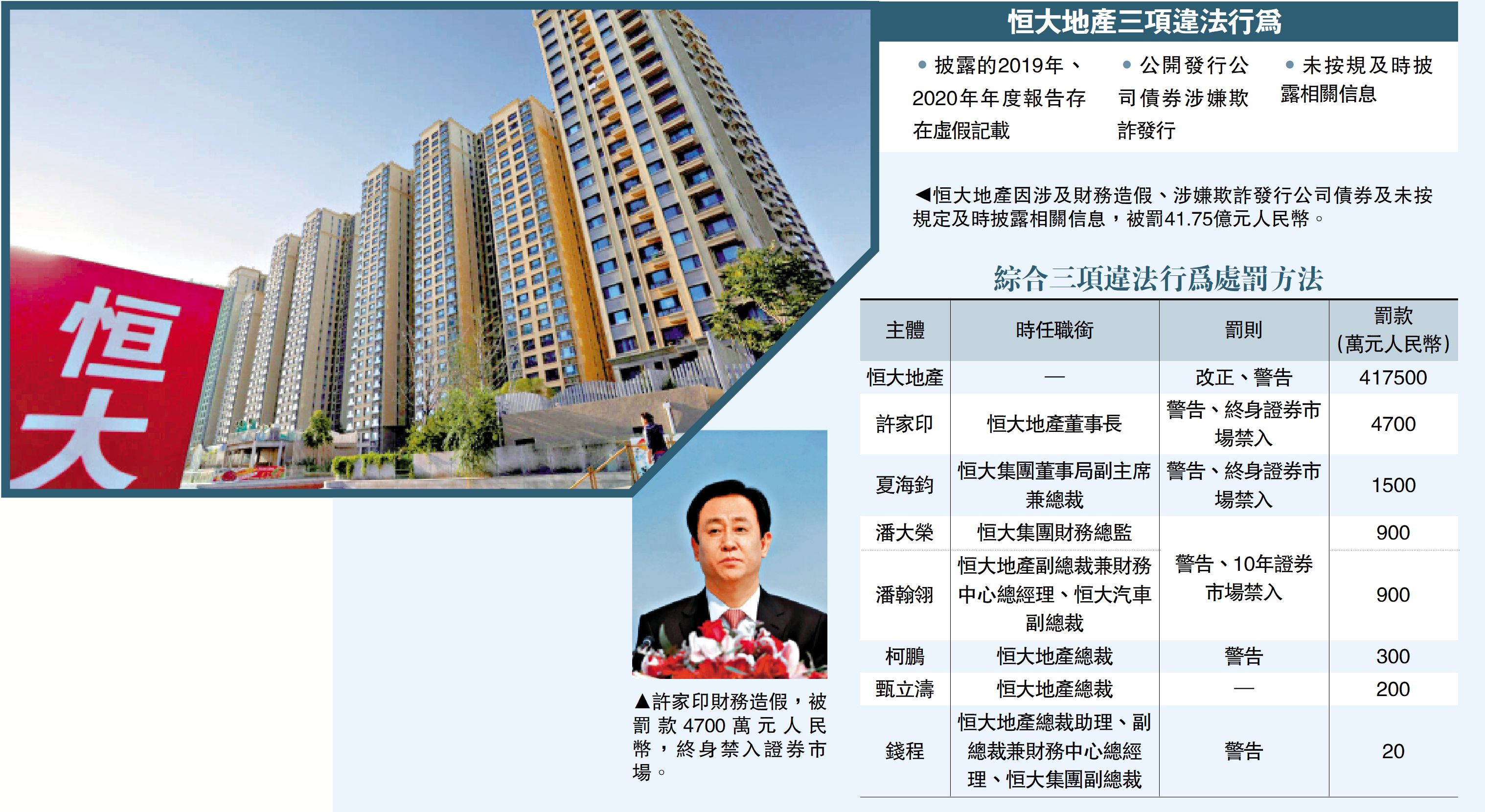 (大公報記者 白靈儀)恒大地產因涉及財務造假、涉嫌欺詐發行公司債券及未按規定及時披露相關信息,中國證監會決定對其處以41.75億元(人民幣,下同,約45.36億港元)罰款,並處罰7名時任管理人員。其中,時任恒大地產董事長許家印及時任恒大集團董事局副主席兼總裁夏海鈞,分別被罰款4700萬及1500萬元。中證監指出,許家印決策並組織實施財務造假;夏海鈞組織安排編製虛假財務報告,兩人因手段特別惡劣,情節特別嚴重,均被終身禁入證券市場。