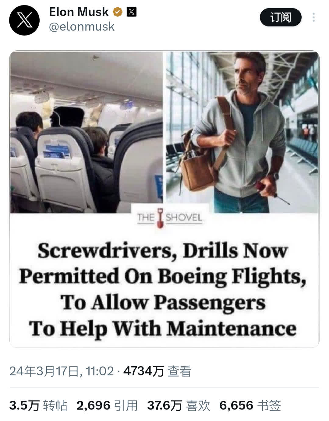 這位億萬富翁17日發布了一張來自澳大利亞新聞諷刺網站「深挖」新聞網的截圖,該網站稱「波音航班現在允許攜帶螺絲刀和鉆頭,以便乘客能夠幫助維修。」這篇開玩笑的報道發布的背景是,最近的一些報道稱波音飛機遭遇多起空中故障。