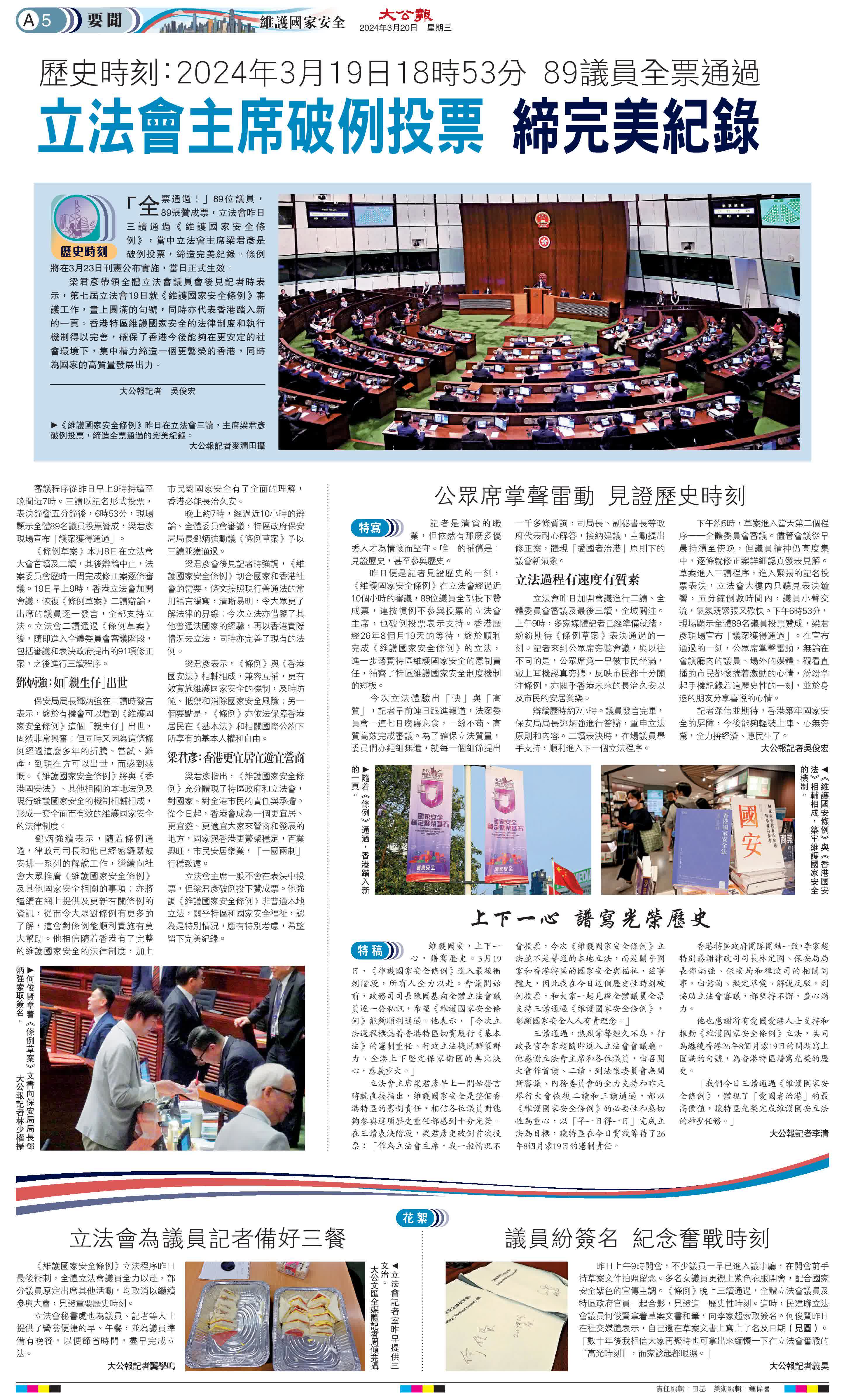 (大公報 記者 吳俊宏)「全票通過!」89位議員,89張贊成票,立法會昨日三讀通過《維護國家安全條例》,當中立法會主席梁君彥是破例投票,締造完美紀錄。條例將在3月23日刊憲公布實施,當日正式生效。