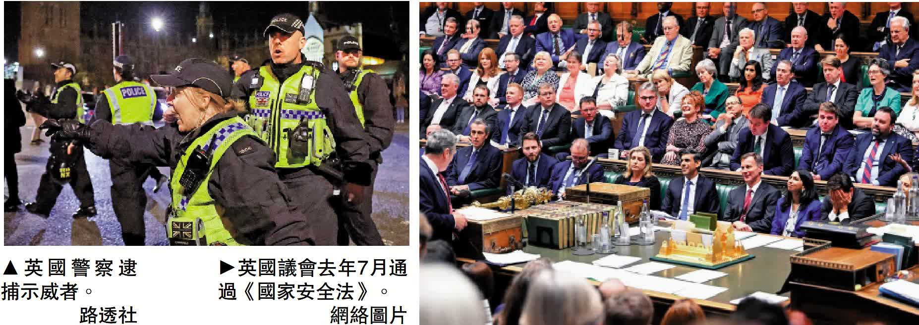 英國政府近年來不斷給本國國安法例加辣。英議會去年7月正式通過《國家安全法》,首次將「外國干預」列作刑事罪,意味着干預投票、言論自由等英國公民基本權利,均屬違法。