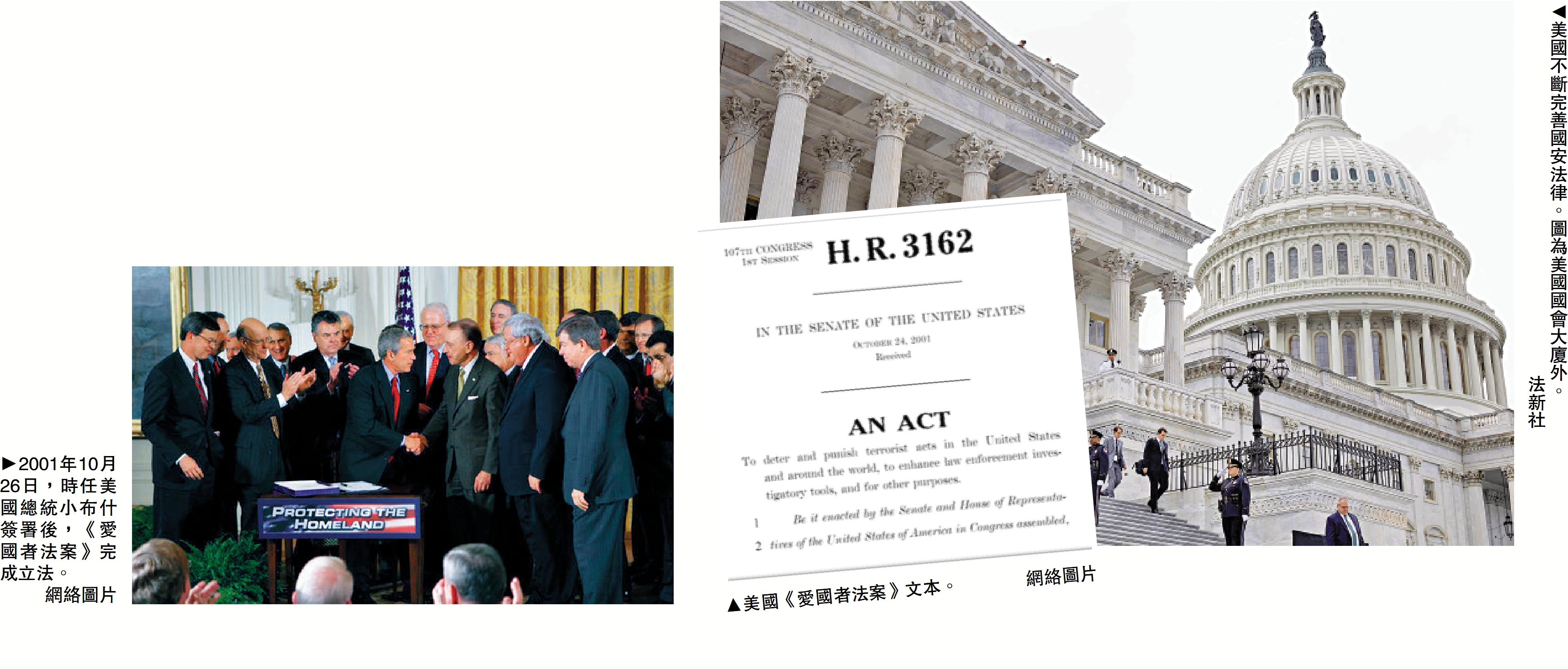 以美國《愛國者法案》為例,這部法律的通過只用了45天,眾議院及參議院分別在一日通過法例,其間沒有舉行一場公開聽證會,也未展開任何形式的公眾諮詢。「9·11」事件發生21天後,10月2日,時任美國司法部長阿什克羅夫特就向國會提交相關法律草案。