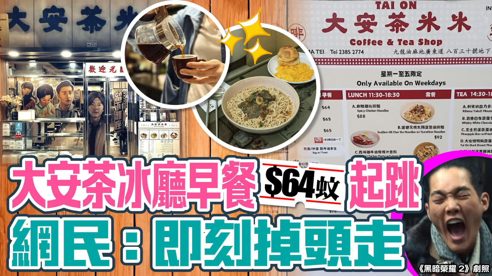 大公文匯全媒體報道,食茶餐廳可以豐儉由人,近日網上流傳數張照片,顯示油麻地大安茶冰廳貼在門口的餐牌,可見早餐、常餐和下午茶的價目較一般茶餐廳貴。帖文隨即引來網民熱議,有人直言指「lunch 65蚊都覺得攞命。嘩65蚊果早餐。我食唔起」、「即刻掉頭走」、「好狠貴」、「好過去搶呀!」、「呢啲價睇完算啦」。