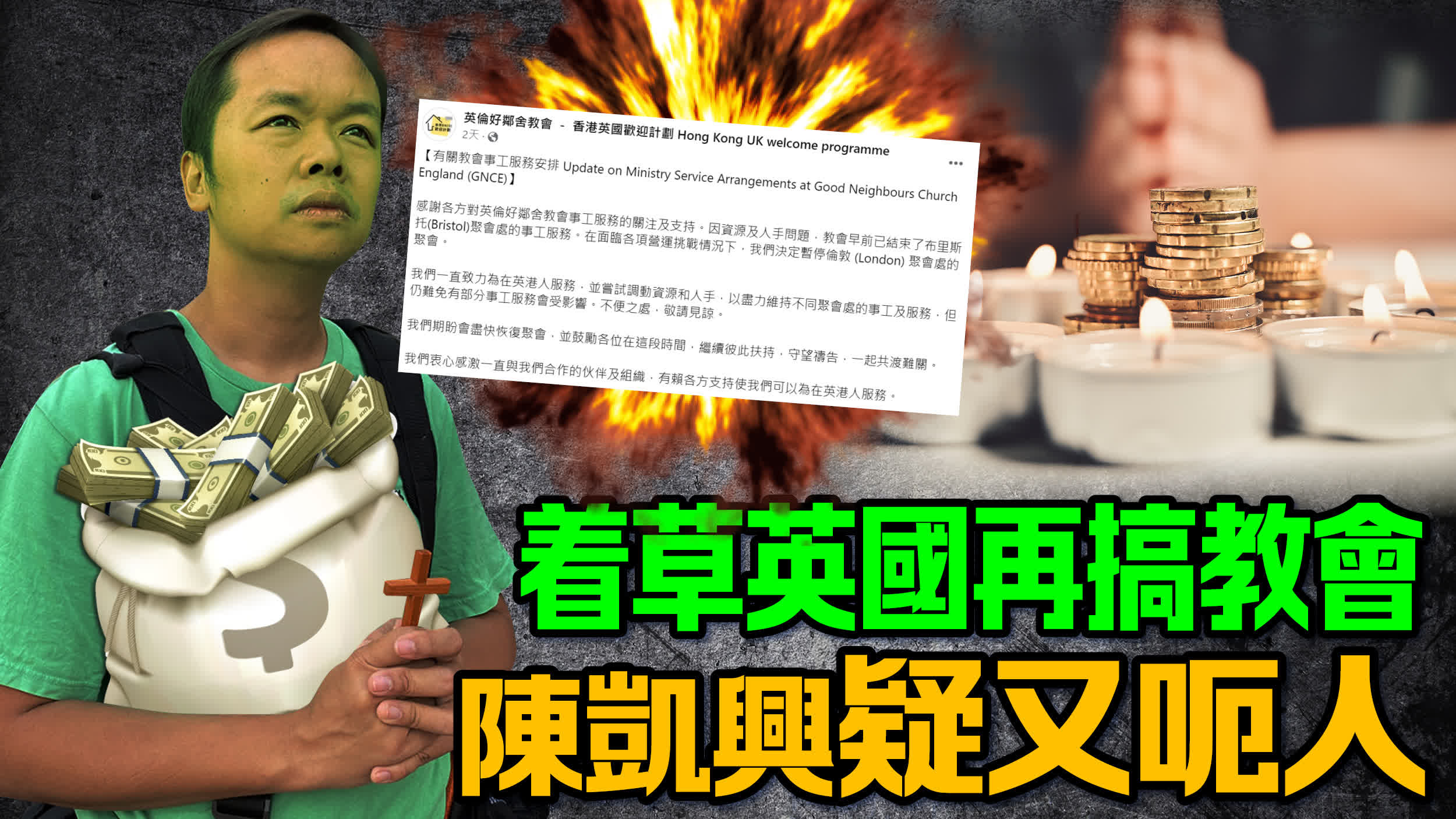 大公文匯全媒體報道,在黑暴期間庇暴、被揭涉嫌欺詐同洗黑錢俾警方通緝的「好鄰舍北區教會」創辦人陳凱興,着草到英國創辦的「英倫好鄰舍教會」,近日爆出財務問題,聲稱因資源及人手安排,先後關閉碧仙桃及倫敦會址。