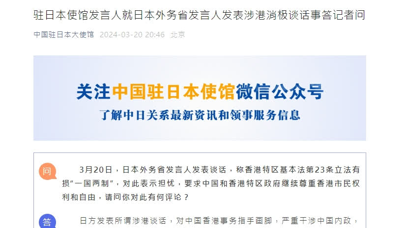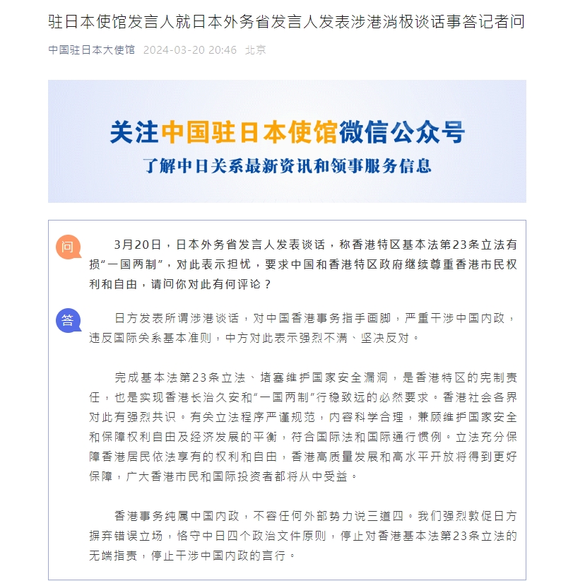 大公文匯全媒體報道,3月20日,中國駐日本大使館官網發布了《駐日本使館發言人就日本外務省發言人發表涉港消極談話事答記者問》,強烈敦促日方摒棄錯誤立場,恪守中日四個政治文件原則,停止對香港基本法第23條立法的無端指責,停止干涉中國內政的言行。以下為全文: