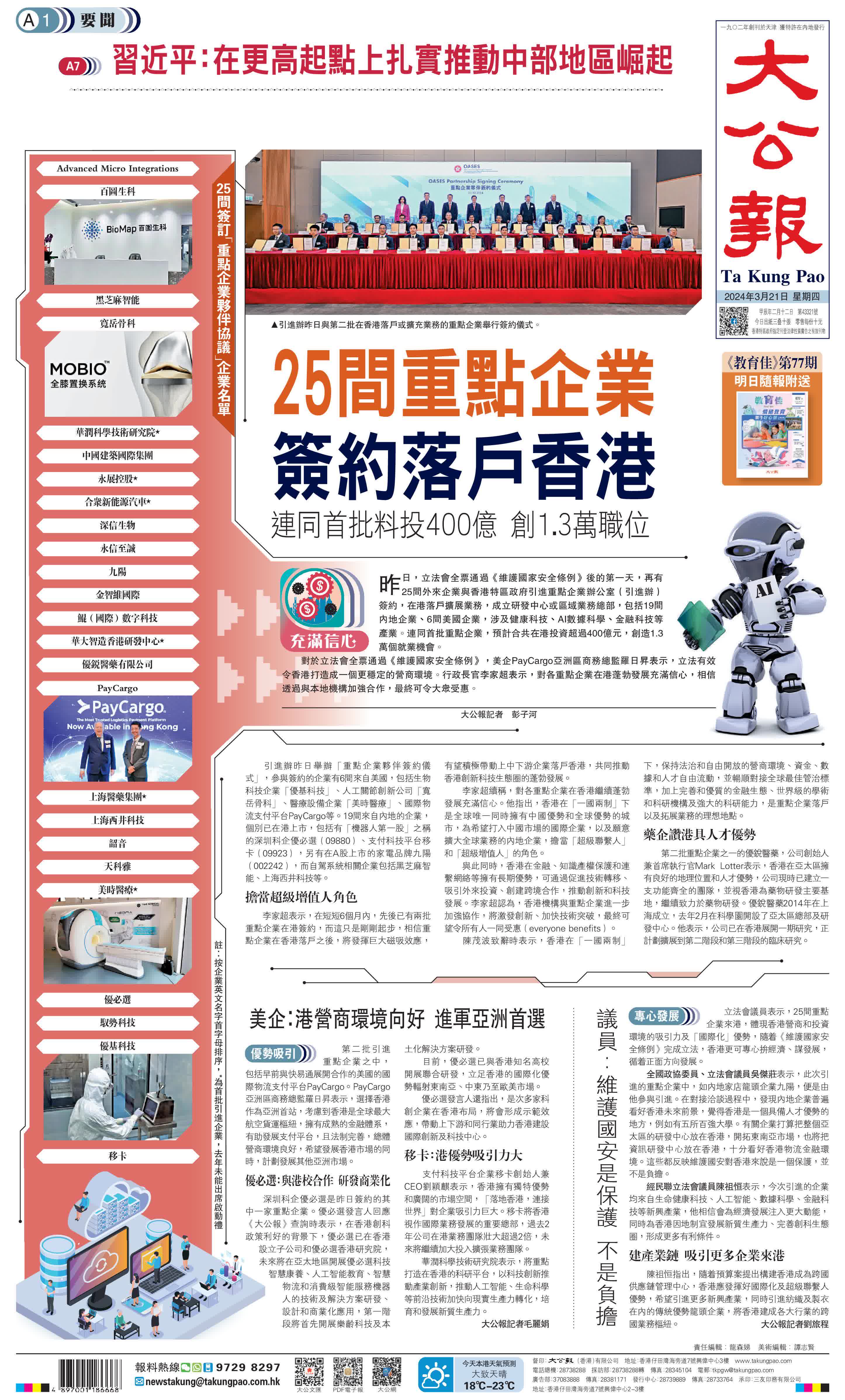 (大公報記者 彭子河)昨日,立法會全票通過《維護國家安全條例》後的第一天,再有25間外來企業與香港特區政府引進重點企業辦公室(引進辦)簽約,在港落戶擴展業務,成立研發中心或區域業務總部,包括19間內地企業、6間美國企業,涉及健康科技、AI數據科學、金融科技等產業。連同首批重點企業,預計合共在港投資超過400億元,創造1.3萬個就業機會。
