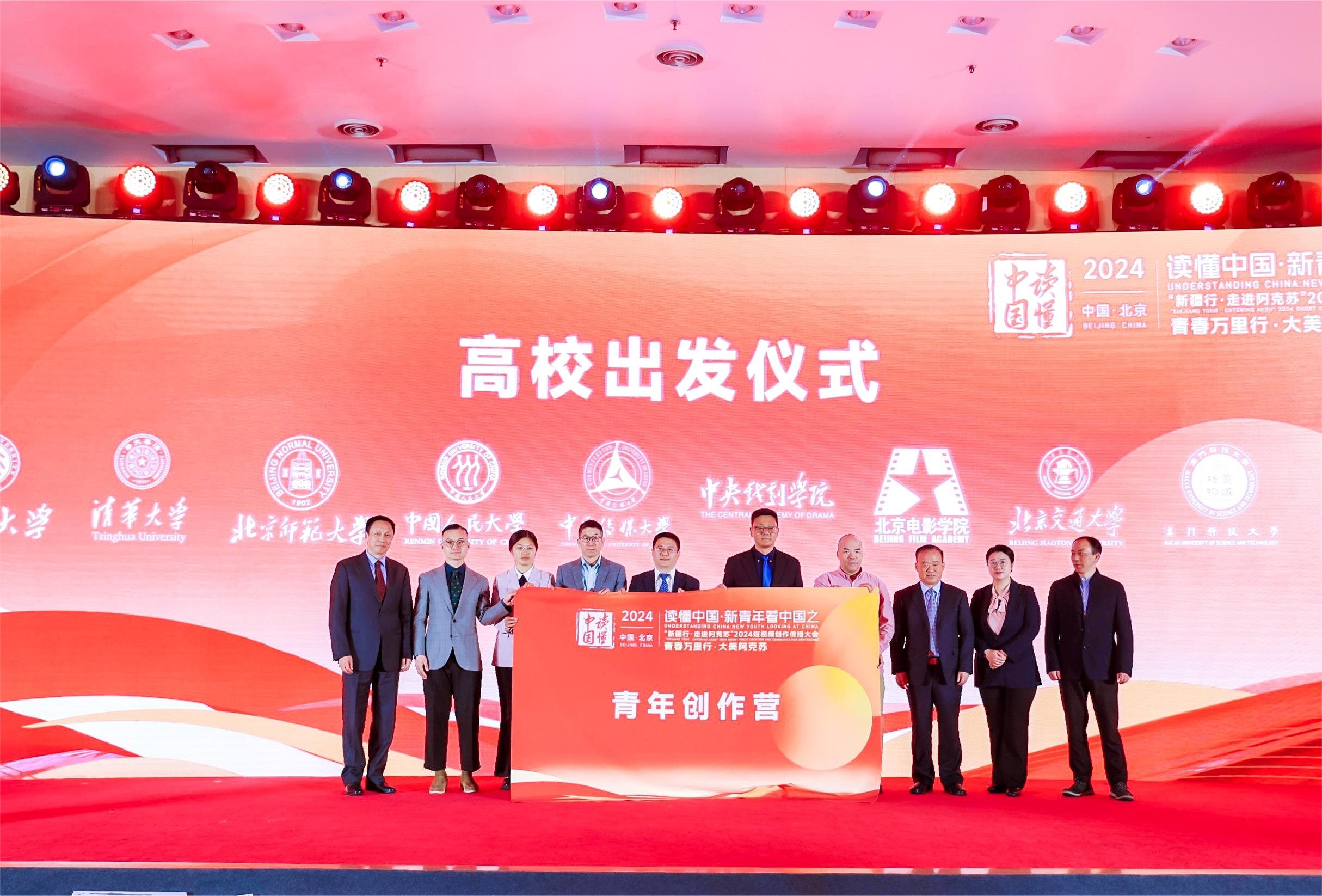 在「全國高校聯動大學生(留學生)短視頻創作營」環節,嘉賓為北京大學、清華大學、北京師範大學、澳門科技大學等知名高校授旗,邀請港澳青年在內的中外青年走進阿克蘇傾情創作。北京師範大學藝術與傳媒學院副院長楊乘虎發言時提出,大學生作為社會發展中的重要角色,具有蓬勃的、藉助互聯網而生發出來的新質生產力和創造力,是時代的記錄者和影像的傳播者,號召青年創作者心系阿克蘇的發展、新疆的發展,乃至時代的發展,用鏡頭看世界,用文化搭橋樑,建立起世界與中國文化的奇妙鏈接。