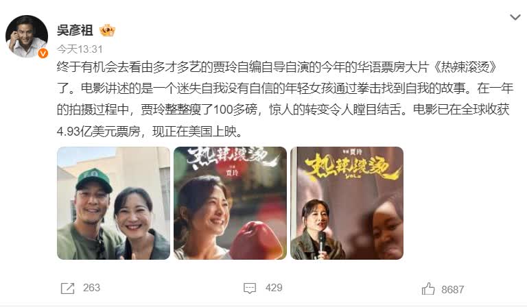 據悉,賈玲近日在美國監製海外版《你好,李煥英》。吳彥祖今次現身系為《熱辣滾燙》在美國的上映助陣。
