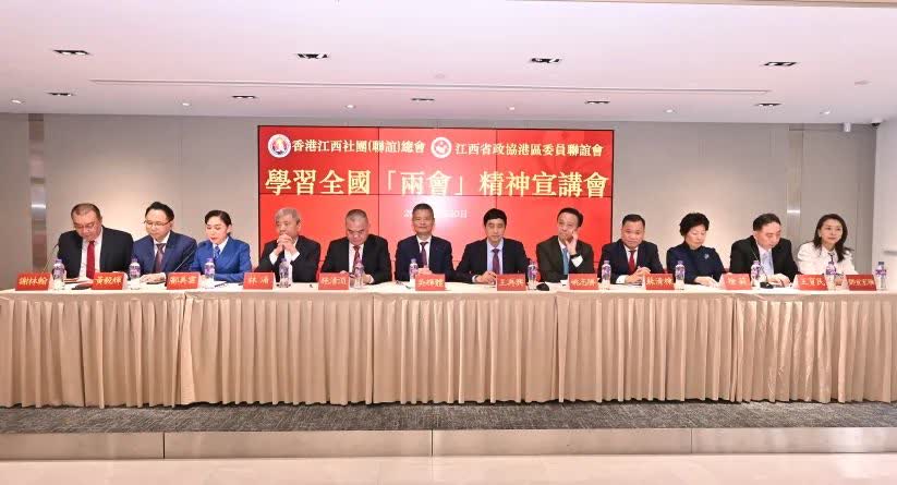 江西省政協常委、香港江西社團(聯誼)總會執行主席、江西省政協港區委員聯誼會會長謝林翰主持宣講會時表示:「在這次『兩會』中,聽到了許多關於香港的聲音和關切。中央政府對香港的發展給予了高度關注和支持,強調要堅定不移地貫徹「一國兩制」、「港人治港」、高度自治的方針,確保香港長期繁榮穩定。今年『兩會』的成功召開匯聚無限期待,讓我們一起認證學習『兩會』精神,共同見證巨輪起航。」