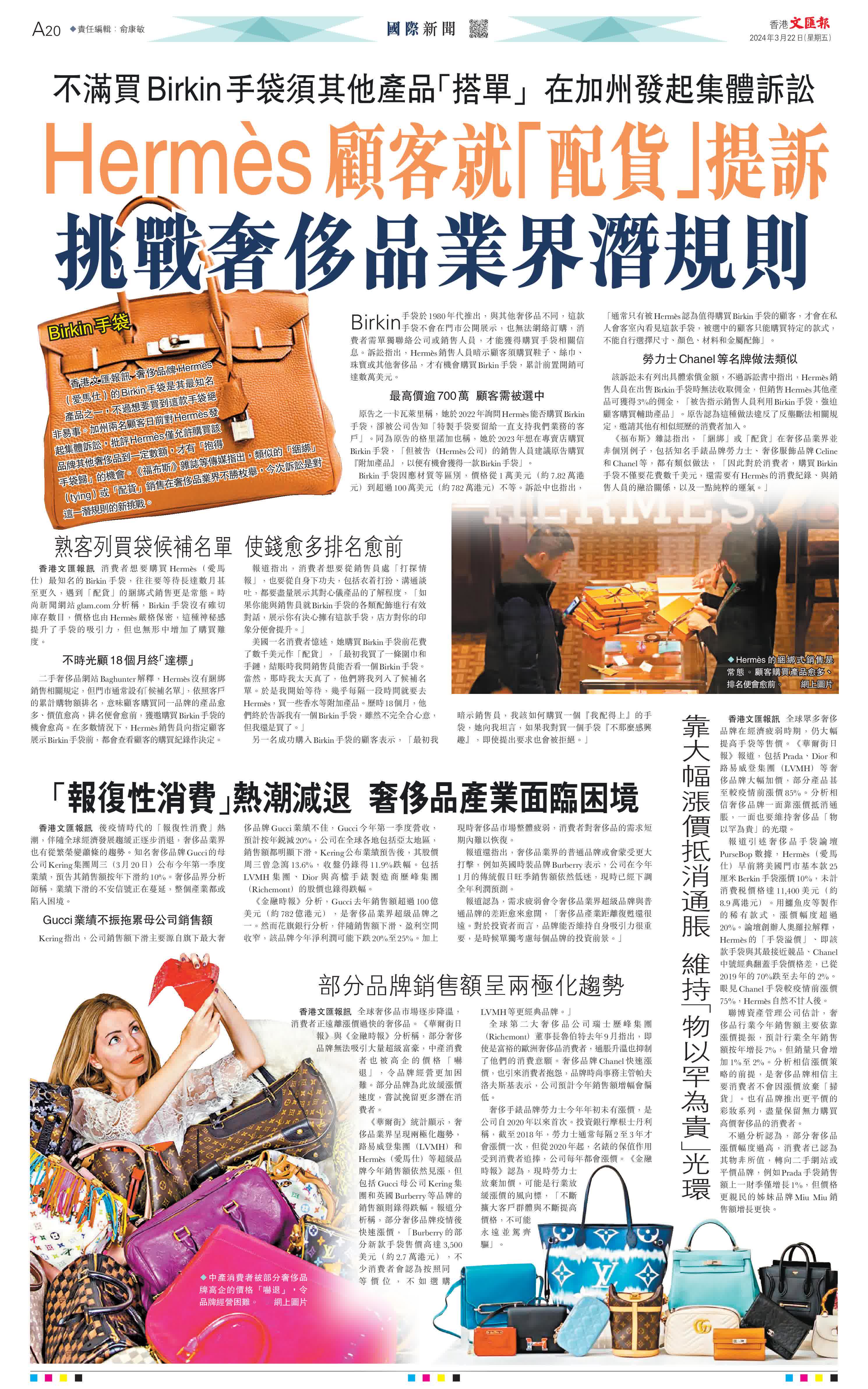 香港文匯報報道,奢侈品牌Hermès(愛馬仕)的Birkin手袋是其最知名產品之一,不過想要買到這款手袋絕非易事。加州兩名顧客日前對Hermès發起集體訴訟,批評Hermès僅允許購買該品牌其他奢侈品到一定數額,才有「抱得手袋歸」的機會。《福布斯》雜誌等傳媒指出,類似的「綑綁」(tying)或「配貨」銷售在奢侈品業界不勝枚舉,今次訴訟是對這一潛規則的新挑戰。