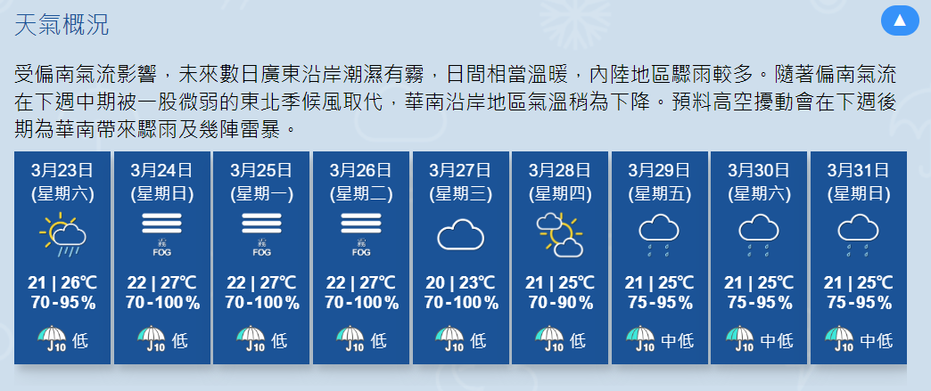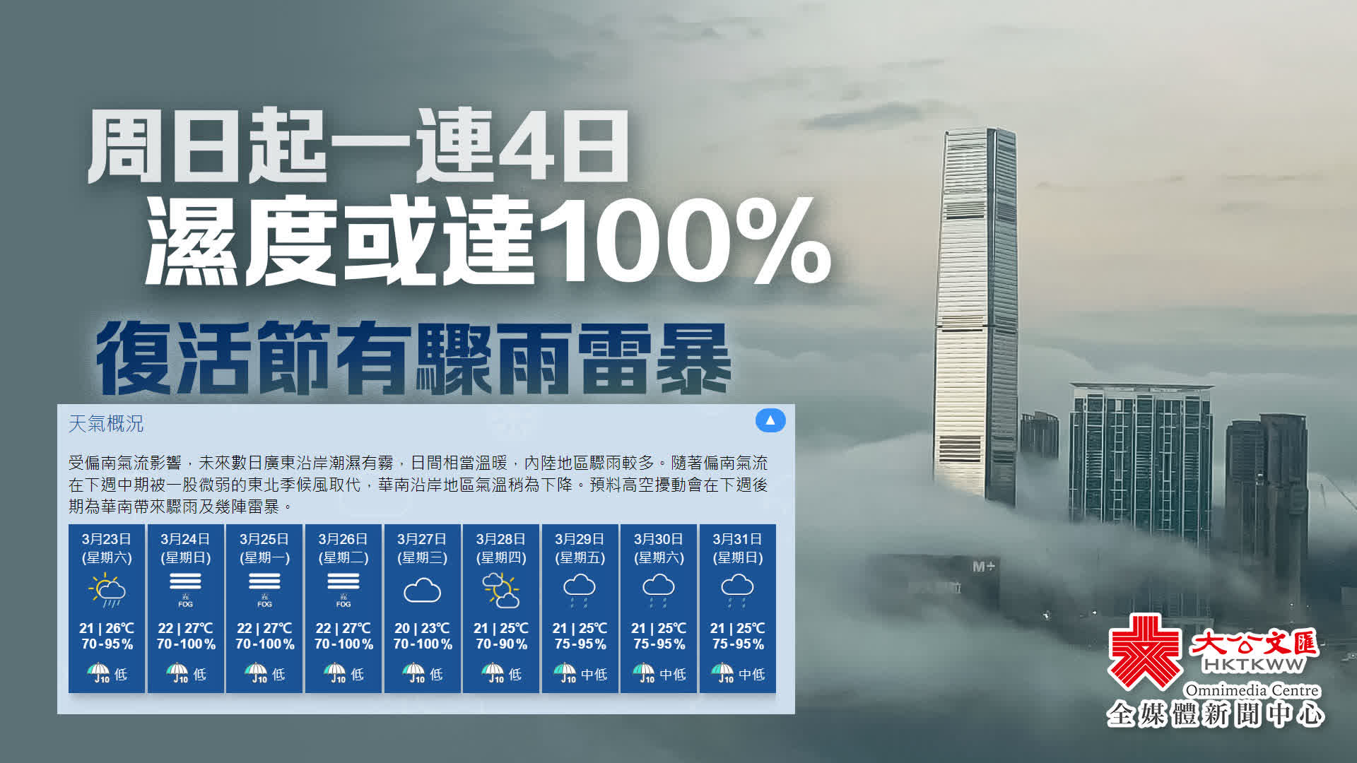 大公文匯全媒體報道,受偏南氣流影響,未來數日廣東沿岸潮濕有霧,日間相當溫暖,內陸地區驟雨較多。天文台今日(22日)預料,自周日(24日)起一連4日濕度均有機會達100%。而高空擾動則會在復活節假期間(30至31日)為本港帶來幾陣驟雨、局部地區有雷暴。