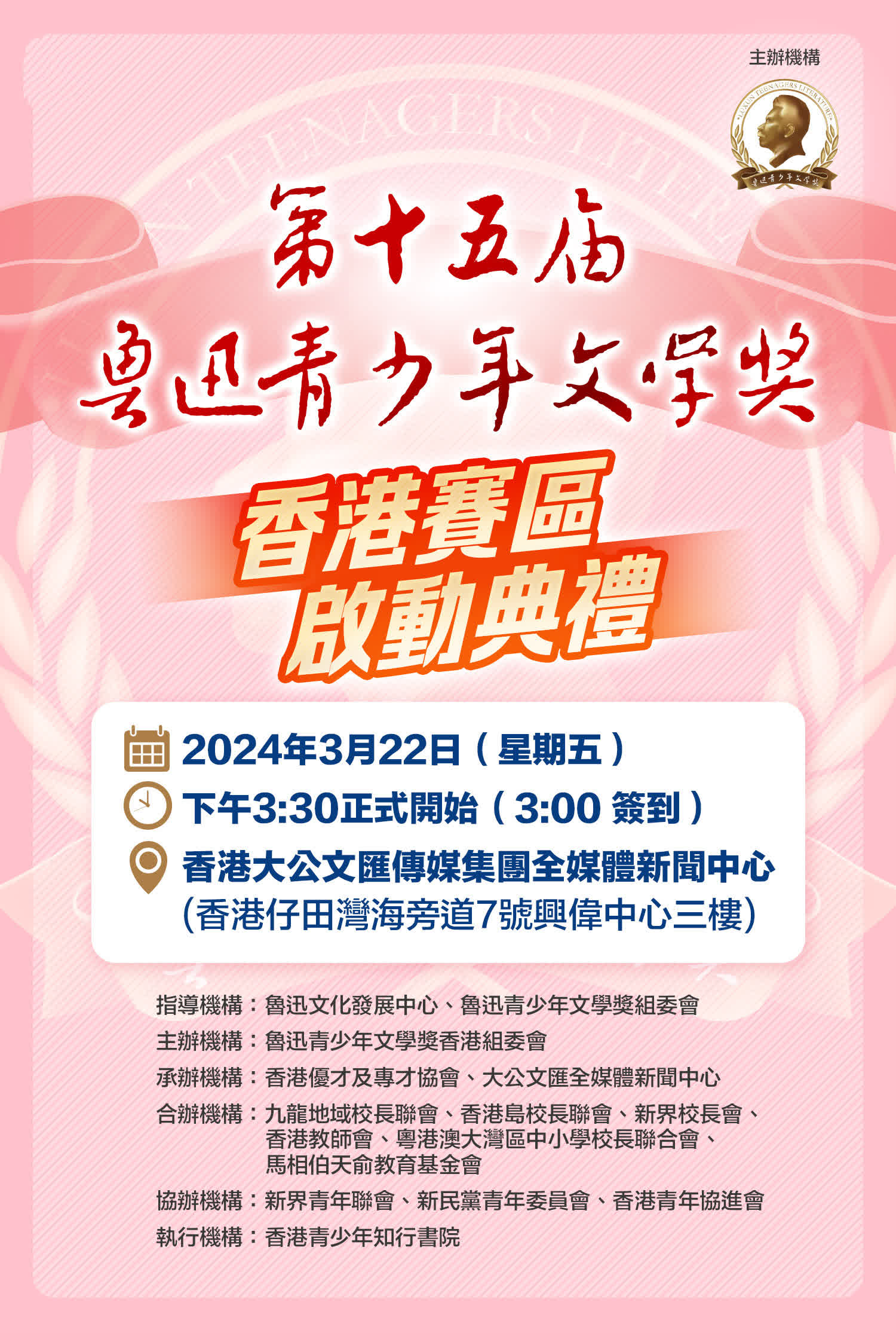 大公文匯全媒體報道,今年是魯迅先生誕辰143周年,由魯迅文化發展中心、魯迅青少年文學獎香港組委會主辦,香港優才及專才協會、香港大公文匯傳媒集團全媒體新聞中心承辦的第十五屆魯迅青少年文學獎香港賽區啟動禮今日(22日)下午3時30分在香港大公文匯傳媒集團全媒體新聞中心舉行。
