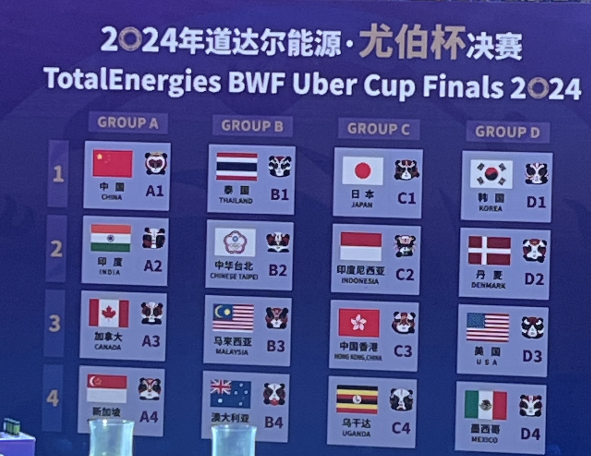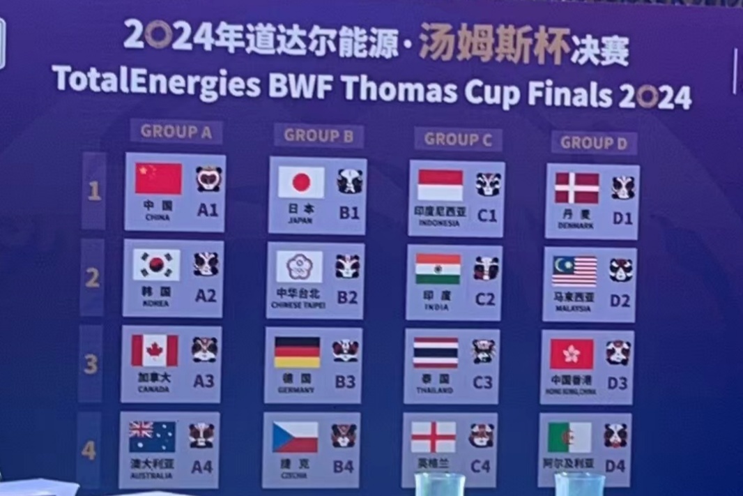 當天,現場抽籤情況為:「湯姆斯杯」:A組有中國隊、韓國隊、加拿大隊、澳大利亞隊,B組有日本隊、中國台北隊、德國隊、捷克隊,C組有印尼隊、印度隊、泰國隊、英格蘭隊,D組有丹麥隊、馬來西亞隊、中國香港隊、阿爾及利亞隊。「尤伯杯」:A組有中國隊、印度隊、加拿大隊、新加坡隊,B組有泰國隊、中國台北隊、馬來西亞隊、澳大利亞隊,C組有日本隊、印尼隊、中國香港隊、烏干達隊,D組有韓國隊、丹麥隊、美國隊、墨西哥隊。