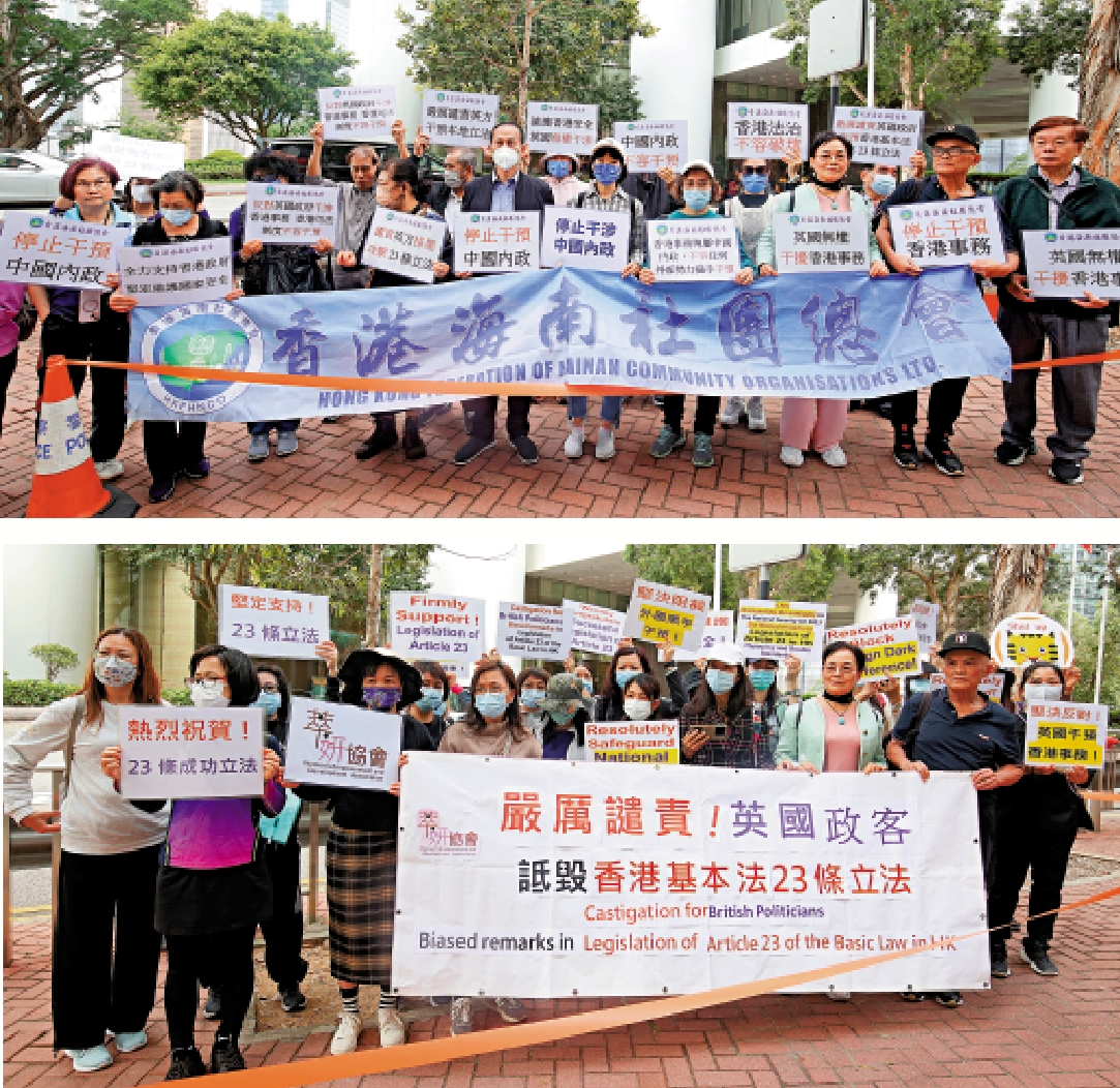 香港海南社團總會昨日前往英國領事館抗議時表示,全力支持特區政府,堅定維護國家安全!反對英國政府干涉香港事務,香港司法制度不容干預!譴責英方抹黑攻擊《維護國家安全條例》!而萃妍協會多名代表嚴厲譴責英國政客詆毀基本法第23條立法,強烈譴責美國、英國、日本妄議、干涉中國內政。