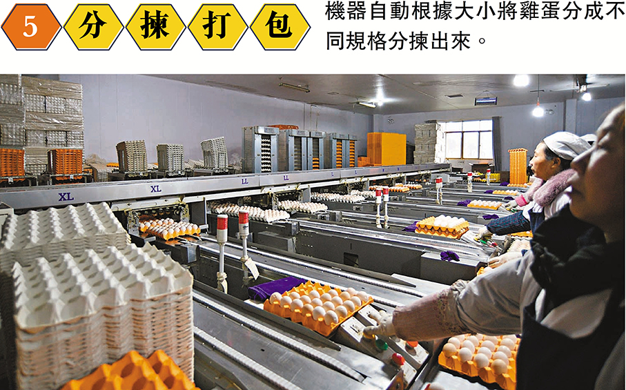 車間的傳送帶,另一頭連接從幾百米外的雞舍,雞蛋經傳送帶滑落到功率為每小時6萬隻的全自動鮮蛋處理流水線上,經過初次檢選、自動清洗、乾燥、光照二檢、紫外線殺菌、分揀打包、裝箱,最後送入庫房。