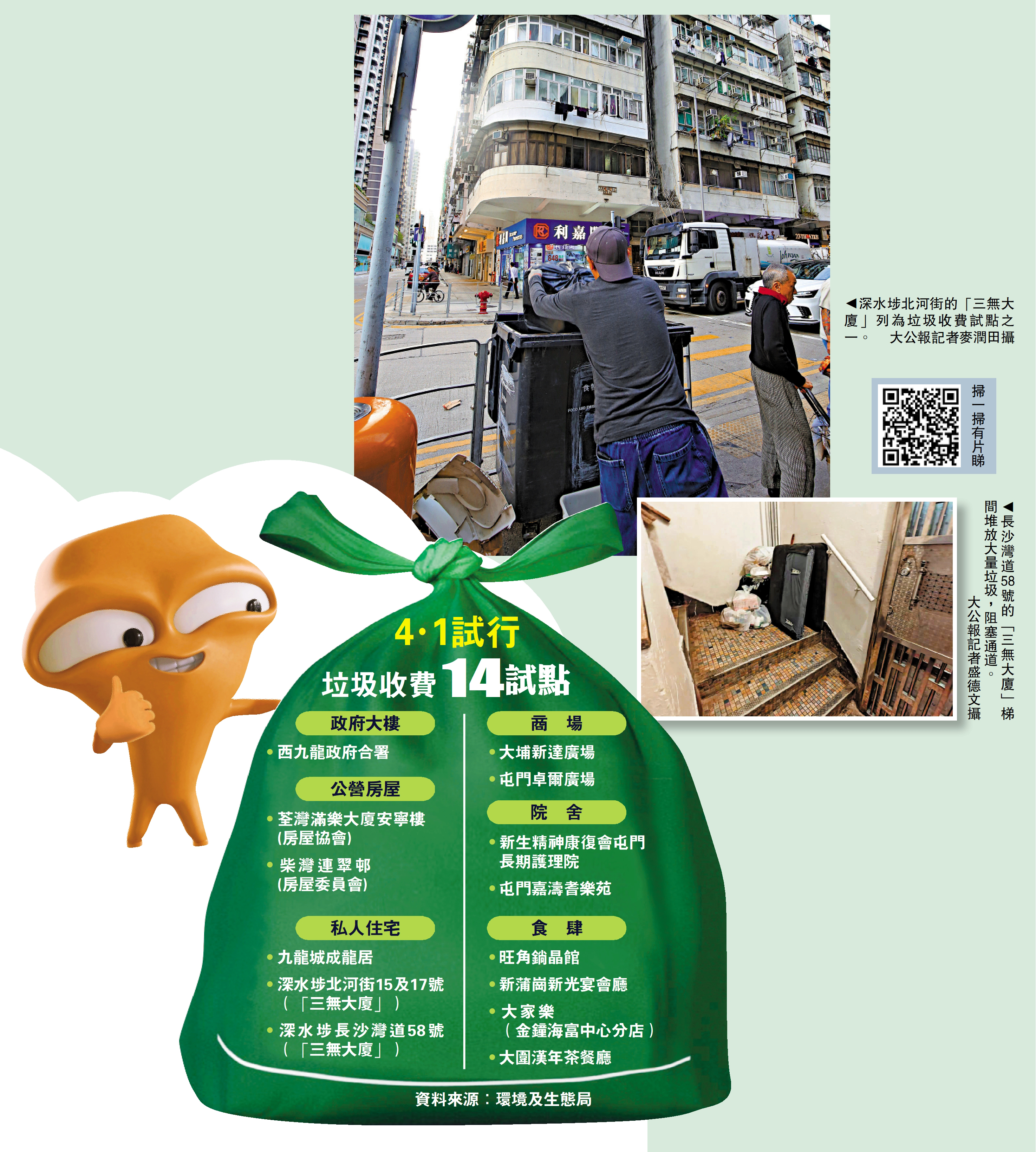 大公報記者昨日實地走訪多個試點,包括深水埗兩幢參與計劃的「三無大廈」,但居民普遍表示不清楚垃圾收費安排,有住戶說聽過環保署職員講解,但仍擔心自己未能配合。