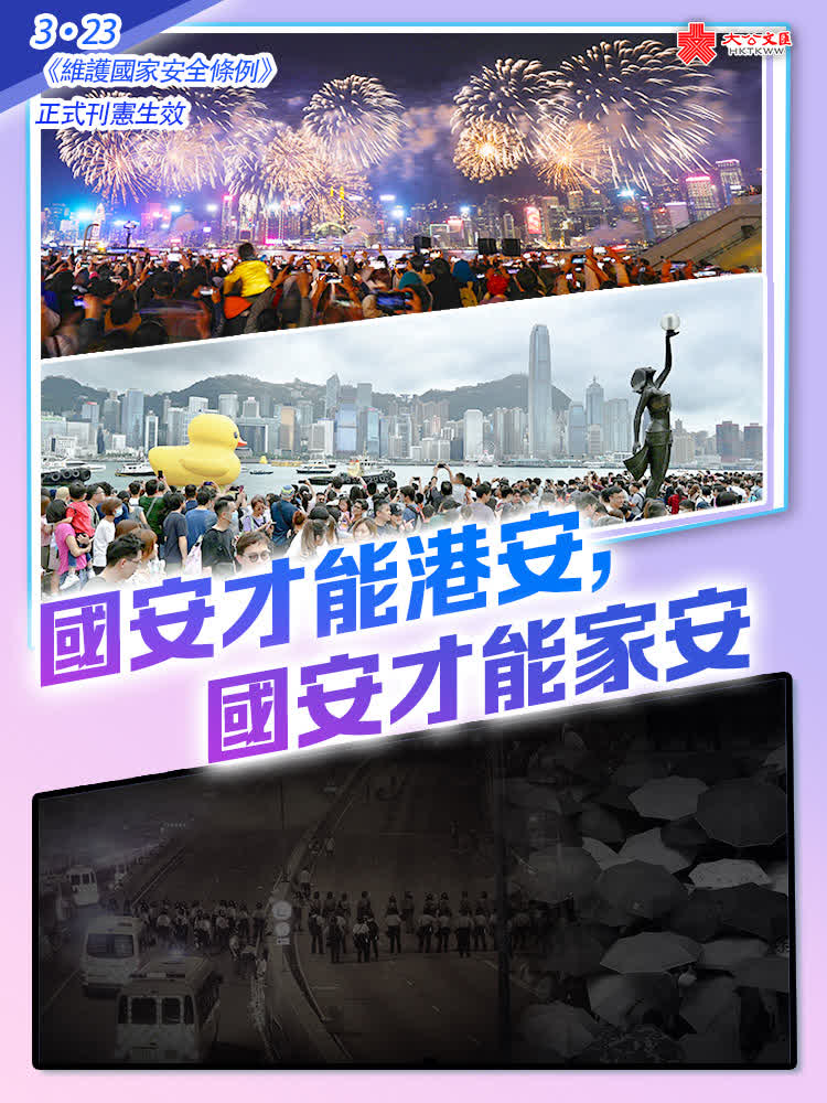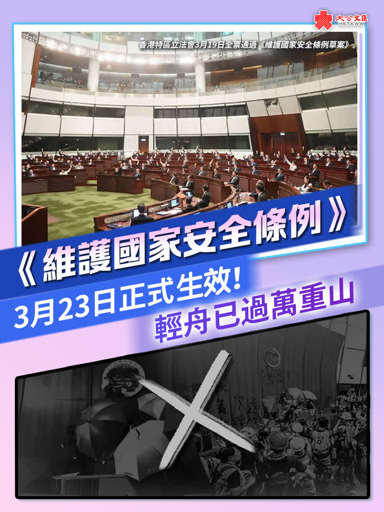 大公文匯全媒體報道,落實基本法第23條立法的《維護國家安全條例》3月19日通過,今日(23日)正式刊憲生效。