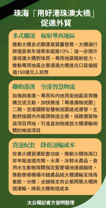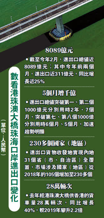 遠東幕牆(珠海)公司通關負責人吳茂慶透露,自港珠澳大橋開通後,企業便從外地搬遷至珠海金灣區,主要出口玻璃幕牆等建材供香港。「從金灣區裝貨出發經大橋出口並抵達香港市場,全程不到3個小時,每天能走30到40車,大橋的高效通關充分提升了企業競爭力。」他說:「得益於大橋通關便利政策不斷創新,企業訂單一年比一年多,去年出口貨值同比增長近1.2倍。」