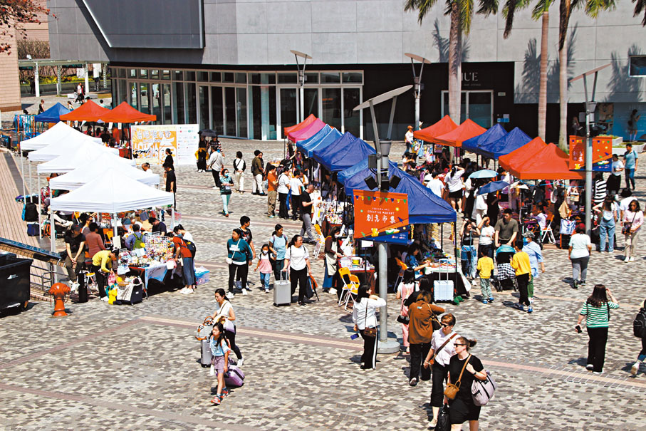 基層墟市從昨日下午1時開始,色彩繽紛的手工藝品吸引了不少市民與遊客駐足欣賞與挑選。在炎熱的天氣下,也有不少人去光顧售賣自家製作涼茶的攤位。