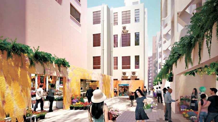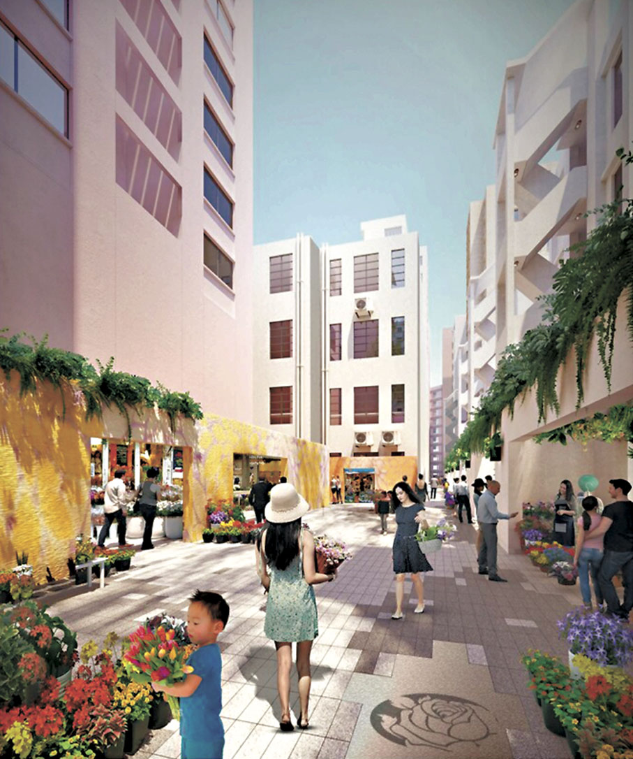 現時花墟的花店多集中在太子道西與花墟道一帶,團隊規劃時沒有進行大規模重建,只選取花墟道一帶4個面積較細、分散零碎而重建潛力和裨益低的16間店舖地段,透過地積比轉移手法,將這些地盤改建成公共空間及低矮建築,維持花墟道低密度發展的氛圍。