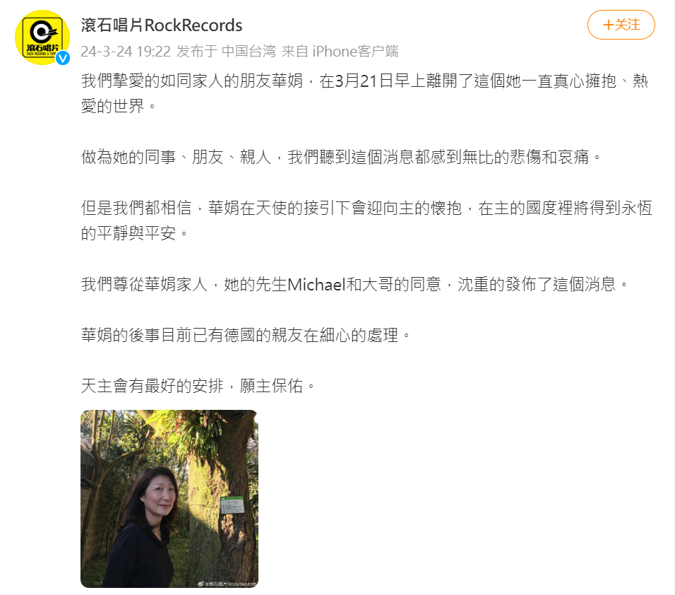 大公文匯全媒體報道,3月24日,滾石唱片發布消息,中國台灣女歌手、詞曲創作者、作家鄭華娟於21日早上離世,終年60歲,後事已由德國親友處理。