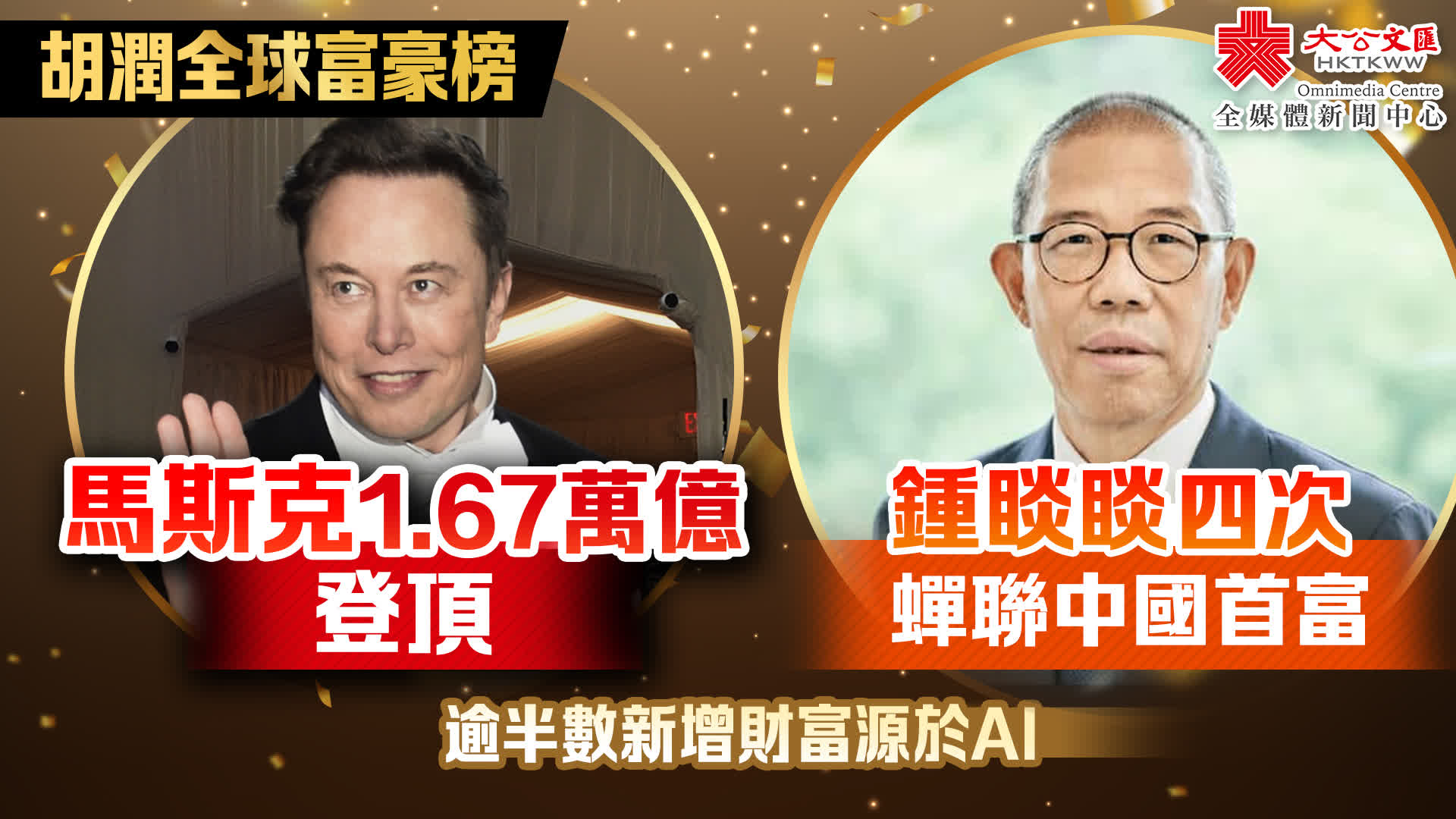 大公文匯網綜合報道,今日(25日),胡潤發布《2024家大業大酒·胡潤全球富豪榜》。共有3279位十億美金企業家上榜,高於去年的3112位。52歲的埃隆·馬斯克以1.67萬億元(人民幣,下同)的財富重登首富寶座。70歲的鍾睒睒財富比去年縮水9%,以4500億元人民幣連續第四次成為中國首富。
