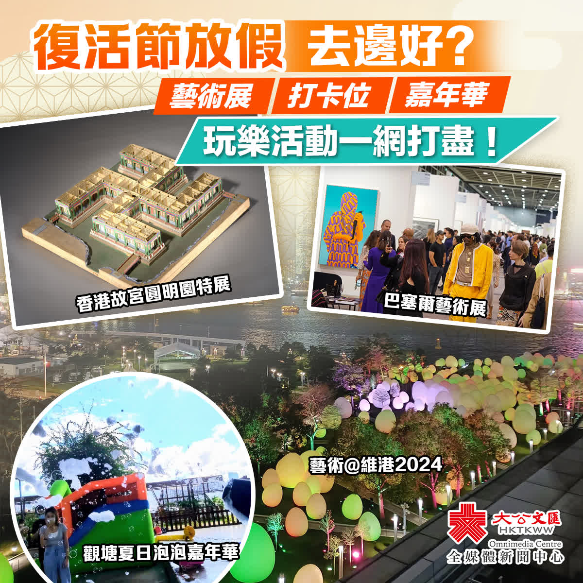 (大公文匯全媒體 記者 張欽、夏芳芳)復活節假期將至,大家想好去哪裏玩了嗎?四天假期,除了外遊,留在香港遊玩也不失為一個好選擇。大公文匯全媒體為你搜羅本港復活節假期好去處,從藝術盛事、文藝打卡到親子出行,一文打盡最新遊玩攻略,感受復活節春日魅力風光。