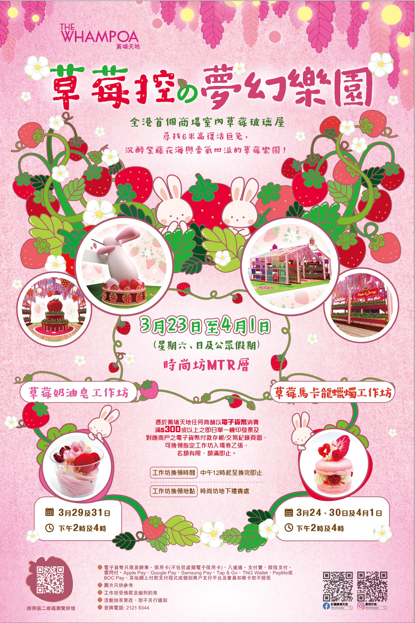 全港首個商場室內草莓樂園復活節假期將降臨黃埔天地,6米高的可愛復活兔守候夢幻樂園,期待與大家一同漫遊「草莓玻璃部屋」,與滿布紫藤花及超過千枚新鮮士多啤梨的「草莓海」打卡!