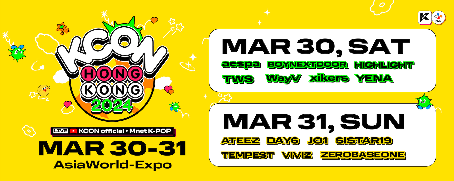 KCON是全球最大型的韓流文化和音樂的粉絲慶典,於2012年在洛杉磯舉辦旗艦活動,並於2015年擴展到紐約,及後在日本、泰國、墨西哥、阿聯酋阿布扎比、沙特阿拉伯等地進行,35場活動涵蓋了12個地區,共吸引160萬粉絲參與。「KCON Hong Kong 2024」首次登陸香港,觀眾不僅可以欣賞韓流歌手表演,還可以透過展覽及見面會感受韓國文化及與韓國偶像接觸。(點此購票)