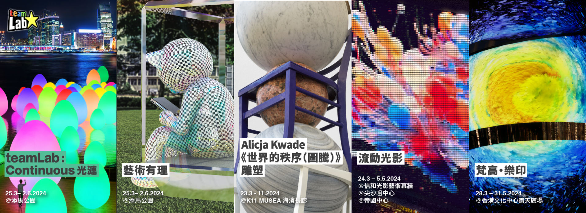 康樂及文化事務署夥拍國際藝術團隊teamLab和香港藝術家,以及一眾合作夥伴,在維港兩岸推出大型戶外藝術計劃「藝術@維港2024」,以多組結合藝術、科學和科技的戶外裝置藝術作品及大屏幕數碼影像,在維港兩岸為市民帶來耳目一新的感官體驗。