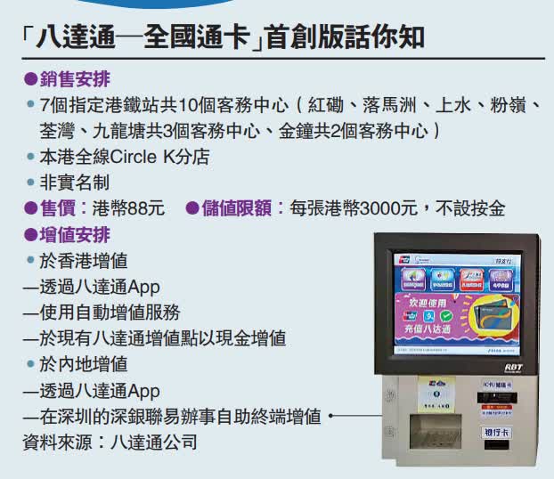 (大公報記者賴振雄、易曉彤)八達通公司昨日宣布,「八達通─全國通卡」首創版將於今日開售,每張88元,一卡通行內地逾336個城市的鐵路或巴士,方便港人四處遊玩,但在內地不能用於零售支付。全國通卡毋須按金,限額3000港元,配合八達通App可隨時查閱餘額、匯率以及交易紀錄,但增值要在指定地點,例如深圳市深銀聯易辦事自助繳費終端機。