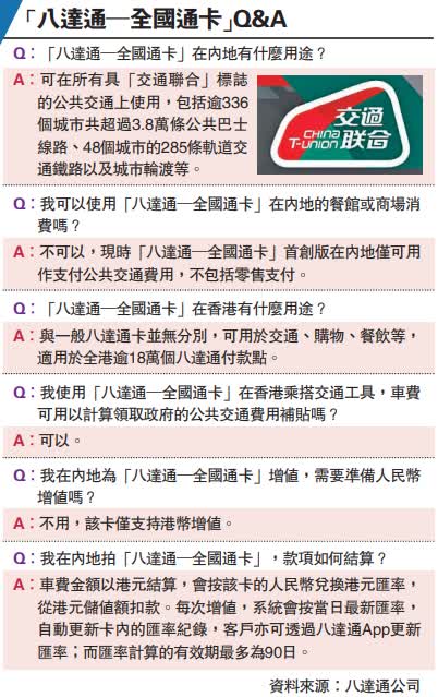 值得留意是,現時透過八達通App,已可開通「八達通銀聯卡」在內地消費,使用銀聯二維碼,已可在全國超過3000萬個消費點使用,所以用戶若希望透過八達通消費,仍可登記「八達通銀聯卡」以彌補全國通卡的不足。